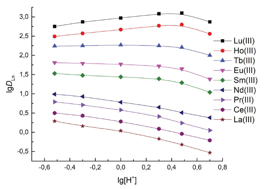 При постоянной концентрации ионов NO3– в водной фазе увеличение концентрации ионов H+ приводит к снижению DLn La(III)–Nd(III) при экстракции смесью ТОДГА–DDAH2SSu (рис. 4). Тангенс угла наклона зависимости lgDLn–lg[H+] для этих Ln(III) составляет –0.6 ± 0.1. В случае экстракции Sm(III)–Tb(III) уменьшение DLn с увеличением кислотности водной фазы менее заметно, а при экстракции Ho(III)–Lu(III) увеличение [H+] от 0.3 до 3 моль/л приводит даже к некоторому увеличению DLn (рис. 4). Эти данные указывают на то, что HNO3 не входит в состав комплексов La(III)–Tb(III), экстрагируемых смесью ТОДГА–DDAH2SSu. Напротив, при экстракции Am(III) и Eu(III) растворами ТОДГА отмечено образование комплексов, в состав которых входят молекулы HNO3 [24–26].
