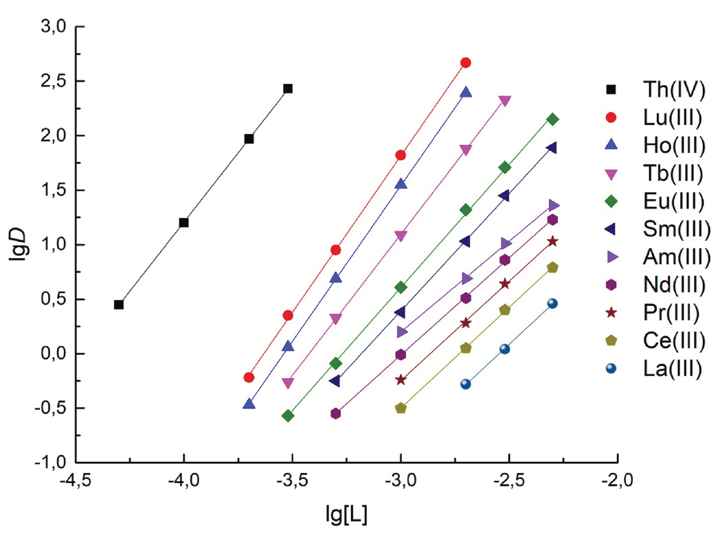 Концентрацию Th(IV), U(VI) и Ln(III) в исходных и равновесных водных растворах определяли методом масс-спектрометрии с ионизацией пробы в индуктивно связанной плазме с использованием масс-спектрометра XSeries II (Thermo Scientific, США). Содержание ионов металлов в органической фазе определяли как разницу между их концентрациями до и после экстракции. Когда эта разница была мала, содержание элементов в органической фазе определяли после реэкстракции водным раствором 0.1 моль/л оксиэтилидендифосфоновой кислоты. Значения коэффициентов распределения (D) рассчитывали как отношение концентраций ионов металлов в равновесных органической и водной фазах. Погрешность определения коэффициентов распределения не превышала 10%.