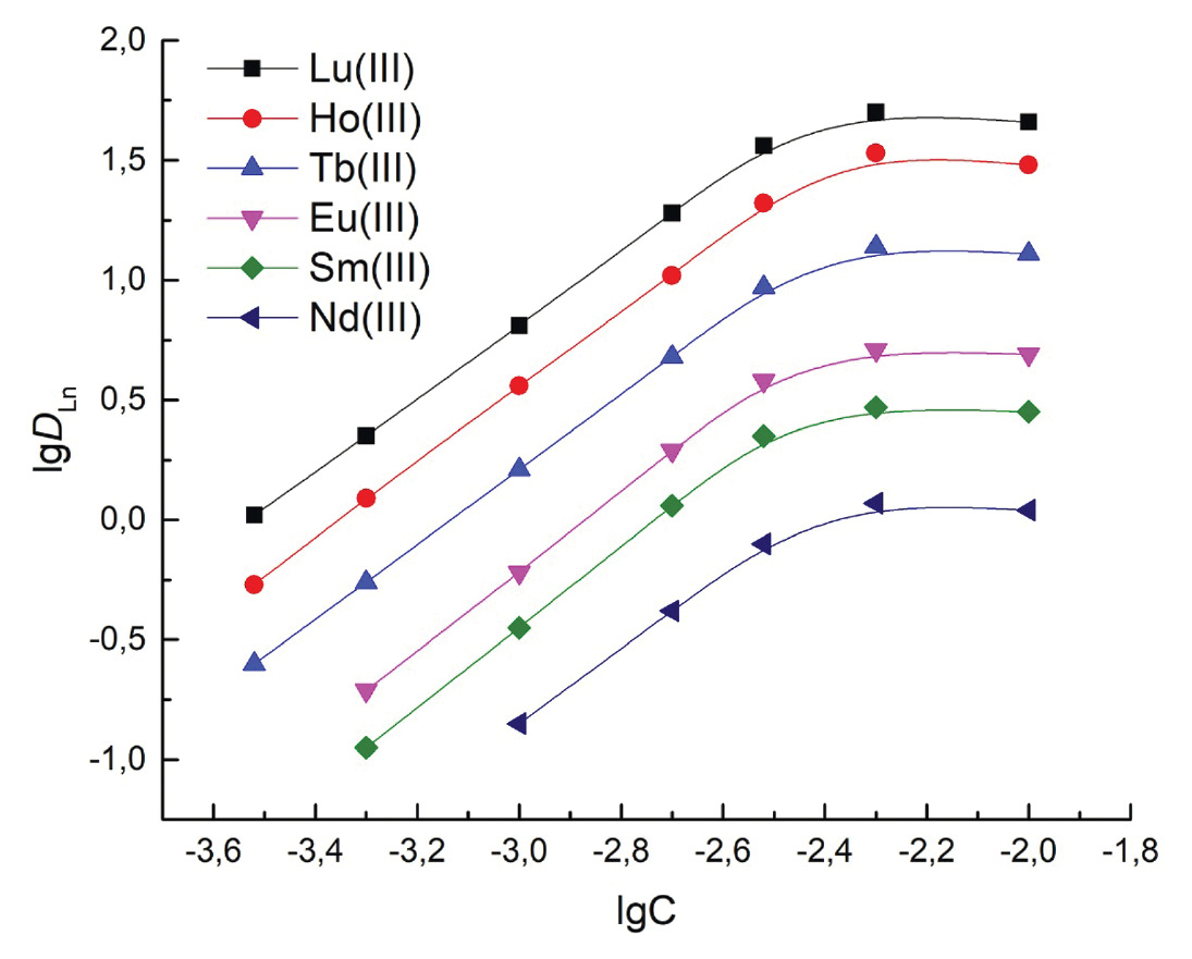При постоянной кислотности водной фазы увеличение в концентрации ионов NO3– в ней сопровождается ростом DLn при экстракции смесью ТОДГА–DDAH2SSu (рис. 5). Тангенс угла наклона зависимости lgDLn–lg[NO3–] для всех Ln(III) составляет 1.5 ± 0.1. Это указывает на участие ионов NO3– в образовании экстрагируемых комплексов в системах с ТОДГА и DDAH2SSu.