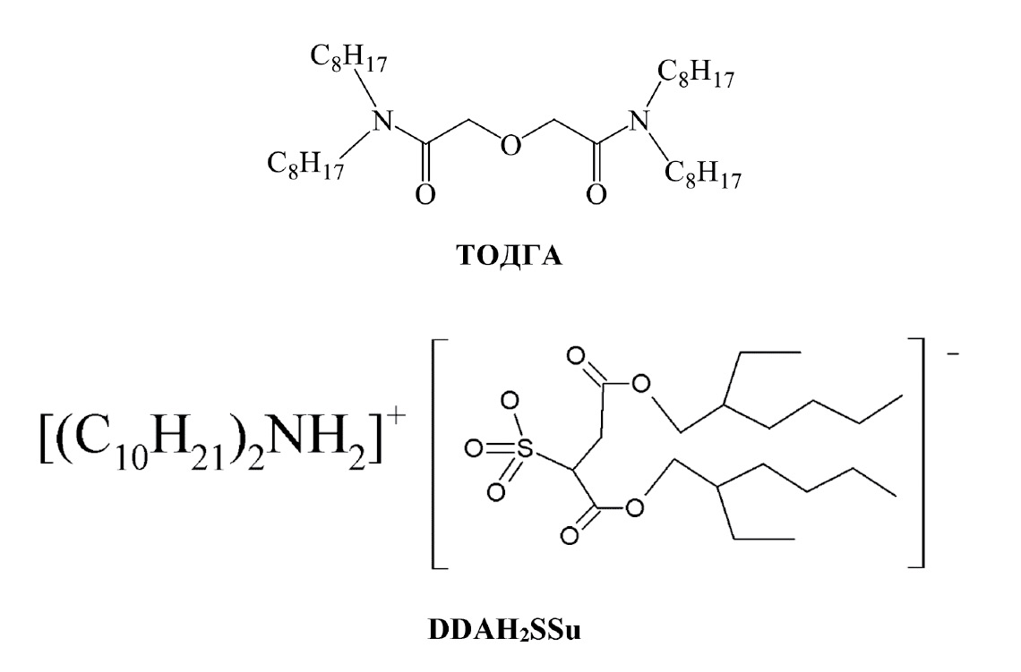 Тетраоктилдигликольамид [21] и ди-2-этилгексилсульфосукцинат дидециламмония [14] синтезированы по известным методикам. В качестве органического растворителя при проведении экстракции использовали додекан (Вектон) марки х.ч. без дополнительной очистки. Растворы ТОДГА и DDAH2SSu в додекане готовили по точным навескам.