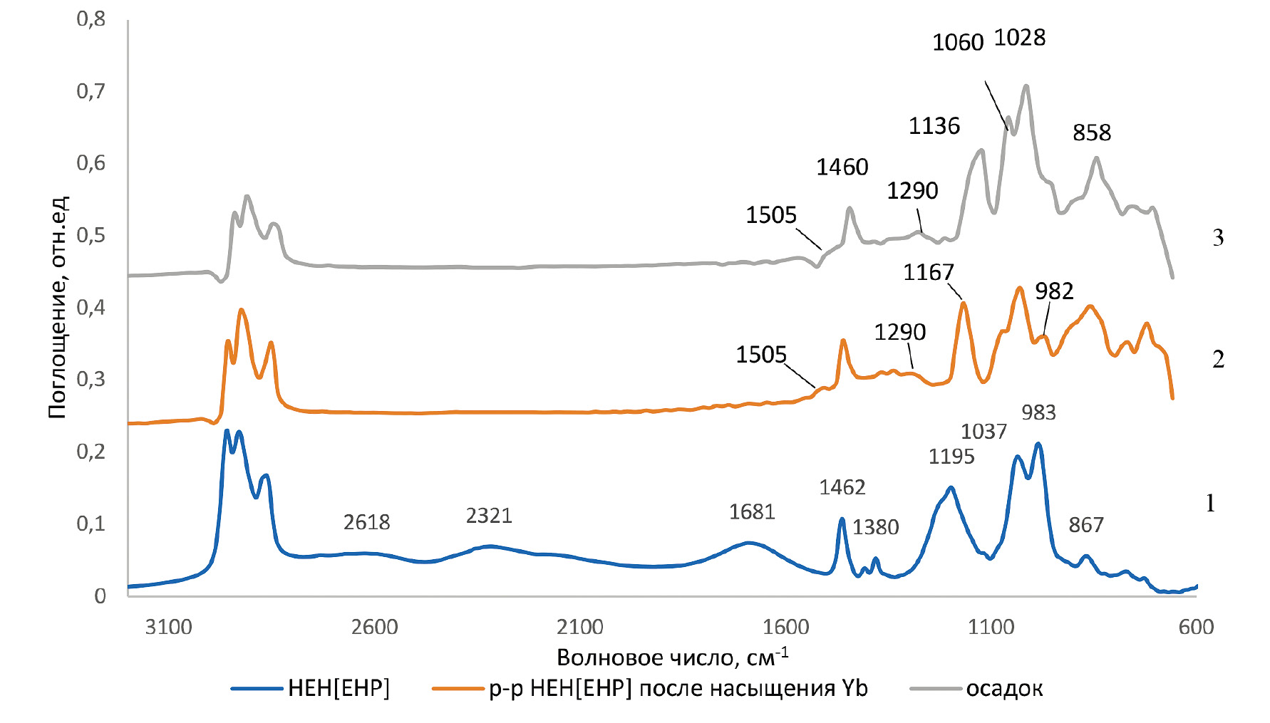 В ИК-спектре раствора HEH[EHP], насыщенного иттербием, отсутствуют полосы поглощения, соответствующие колебаниям Р–O–H-группы ввиду замены водорода на металл. Полоса поглощения связи Р=О при 1196 см–1 претерпевает длинноволновой сдвиг до 1167 см–1, что связано с образованием комплекса с иттербием [12]. Помимо этого, в спектре происходит расщепление полосы при 1037 см–1 на две составляющие – 1028 и 1060 см–1, также относимые к колебаниям связи P–O–C. В спектре осадка продолжается смещение полосы 1167 см–1 в область 1136 см–1, что, по мнению авторов работы [15], свидетельствует об образовании координационной связи между металлом и двумя атомами кислорода и формировании координационной связи в полимере. Кроме того, как в спектре насыщенного иттербием раствора, так и в спектре осадка присутствуют полосы поглощения при 1290 и 1505 см–1, относимые к колебаниям нитратной группы [3], что может являться подтверждением присутствия нитрата в составе экстрагируемого комплекса.