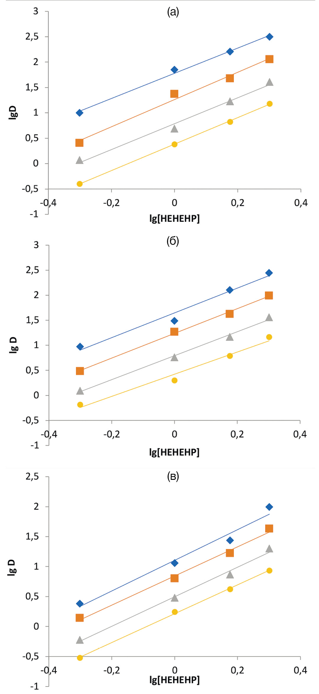 Результаты эксперимента, представленные на рис. 4, показывают, что зависимости lgD–lg[HEHEHP] практически во всем диапазоне исследуемых концентраций металла и азотной кислоты аппроксимируются линейной функцией с тангенсом угла наклона, близким к 2.5. Значения коэффициентов и аппроксимирующих выражений для полученных кривых приведены в табл. Д2 дополнительных материалов к статье. Такие значения тангенса угла наклона согласуются с результатами цитированных выше исследований для систем с неполярными алифатическими растворителями, в том числе при экстракции иттербия [7]. Однако для азотной кислоты с концентрацией 0.5 моль/л наблюдается отклонение от значения 2.5, причем с увеличением концентрации металла тангенс угла наклона увеличивается от 2 до 3.