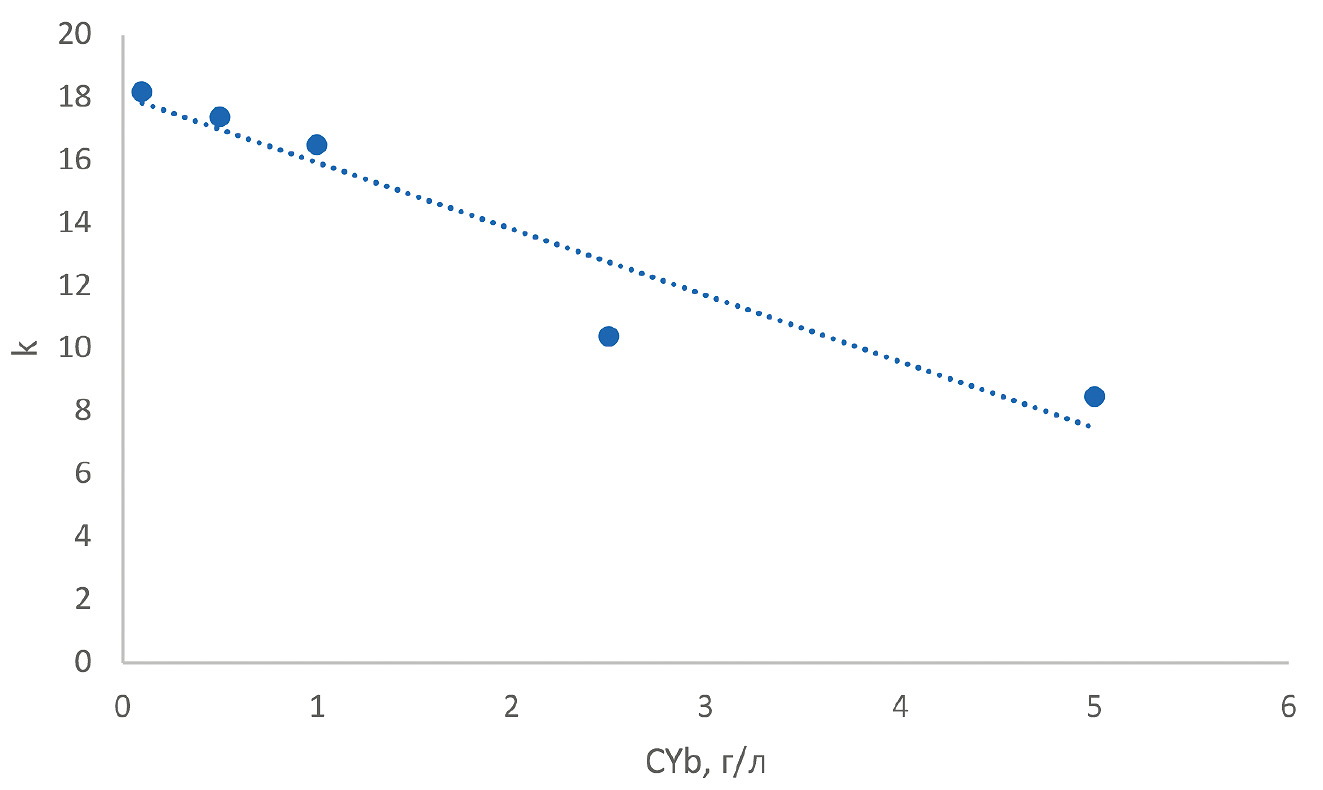 Зависимость константы экстракции от концентрации металла можно описать линейной функцией с коэффициентом корреляции R2 = 0.95. Можно предположить, что зависимость константы экстракции от концентрации иттербия будет описываться выражением: