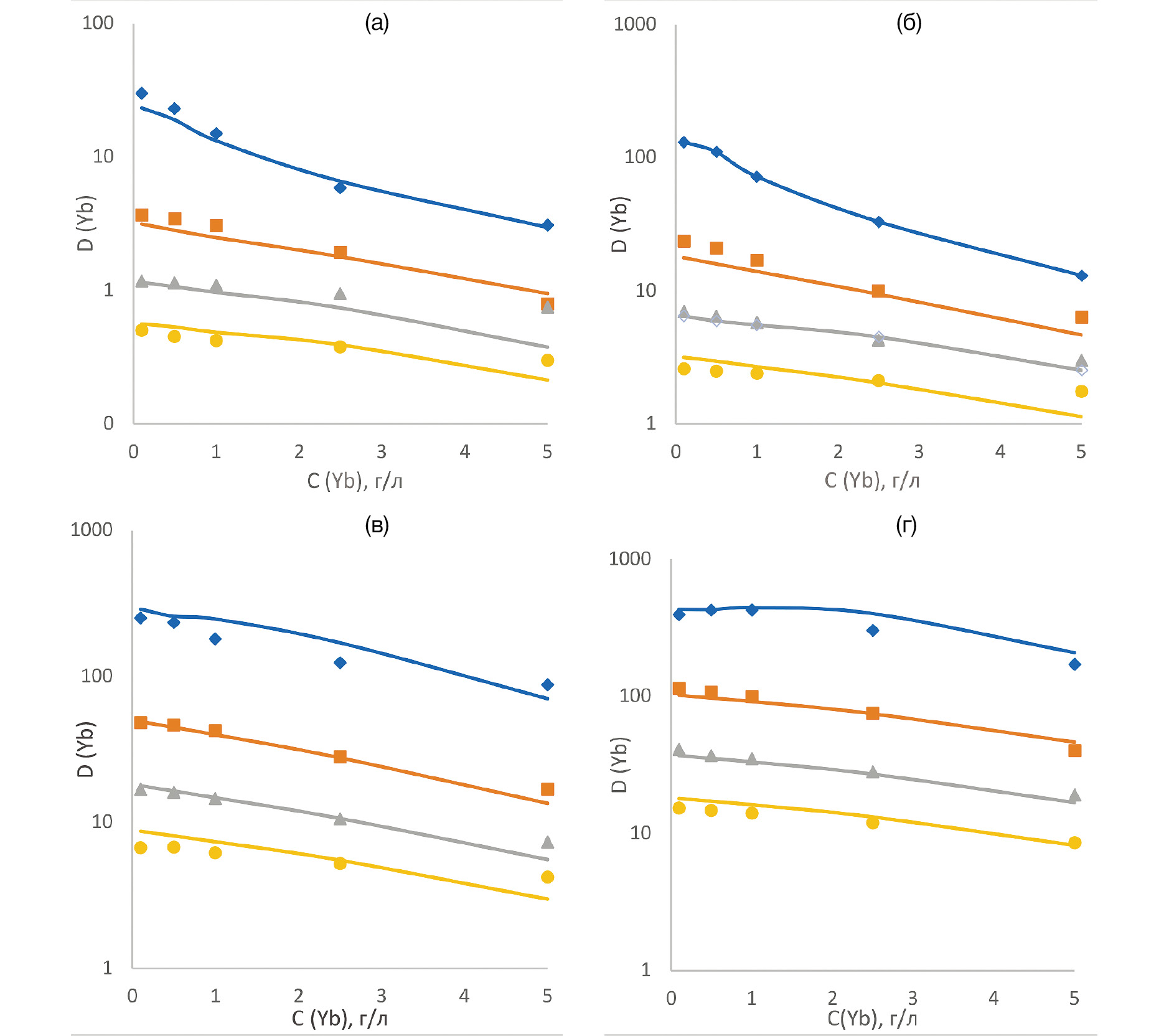 Рис. 6. Зависимость коэффициентов распределения иттербия от его концентрации в водной фазе при экстракции растворами HEH[EHP] различной концентрации в гексане (моль/л: a – 0.5, б – 1, в – 1.5, г – 2) при различных концентрациях азотной кислоты (моль/л: ♦ – 0.5, ■ – 1, ▲ – 1.5, ● – 2). Точки – эксперимент, линии – расчет.