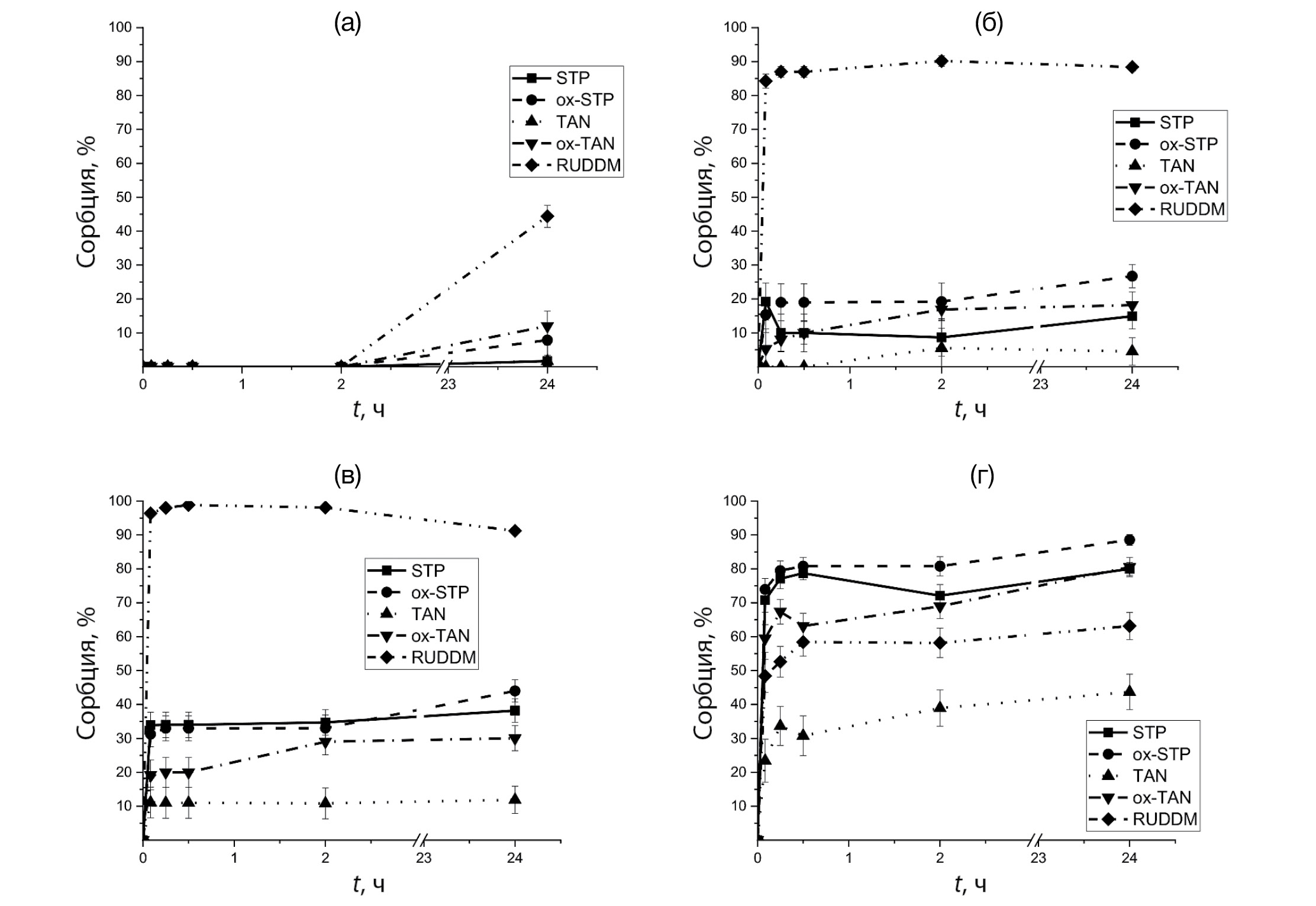 Из рис. 1б–г видно, что при рН от 3 до 5 сорбционное равновесие достигается в первые минуты контакта сорбента с раствором, что ранее наблюдалось нами при исследовании сорбции НА других радионуклидов [4–6]. При рН 3 (рис. 1б) равновесные значения степени сорбции скандия образцом RUDDM составляют около 90%, в то время как для остальных образцов они не превышает 25%. При рН 4 (рис. 1в) RUDDM сорбирует скандий практически количественно (>95%), в то время как TAN и ox-TAN сорбируют только 10 и 30% соответственно, а STP и ox-STP – 35–40%. При рН 5 степень сорбции образцом RUDDM снижается в сравнении с рН 3 и 4 и составляет 60%, а максимальное значение степени сорбции среди изученных НА наблюдалось для ox-STP – 85%. Образцы TAN, ox-TAN и STP сорбировали 40, 75 и 75% скандия соответственно.