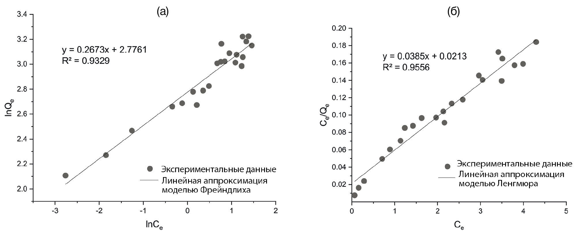 Изотерма Фрейндлиха описывается уравнением (1), где KF – константа Фрейндлиха, nF – параметр, характеризующий интенсивность адсорбции. Для нахождения данных параметров обе части уравнения логарифмировали (уравнение (2)), строили зависимость lnQe от lnCe, аппроксимировали прямой, находили из уравнения прямой значения lnKF и 1/nF:
