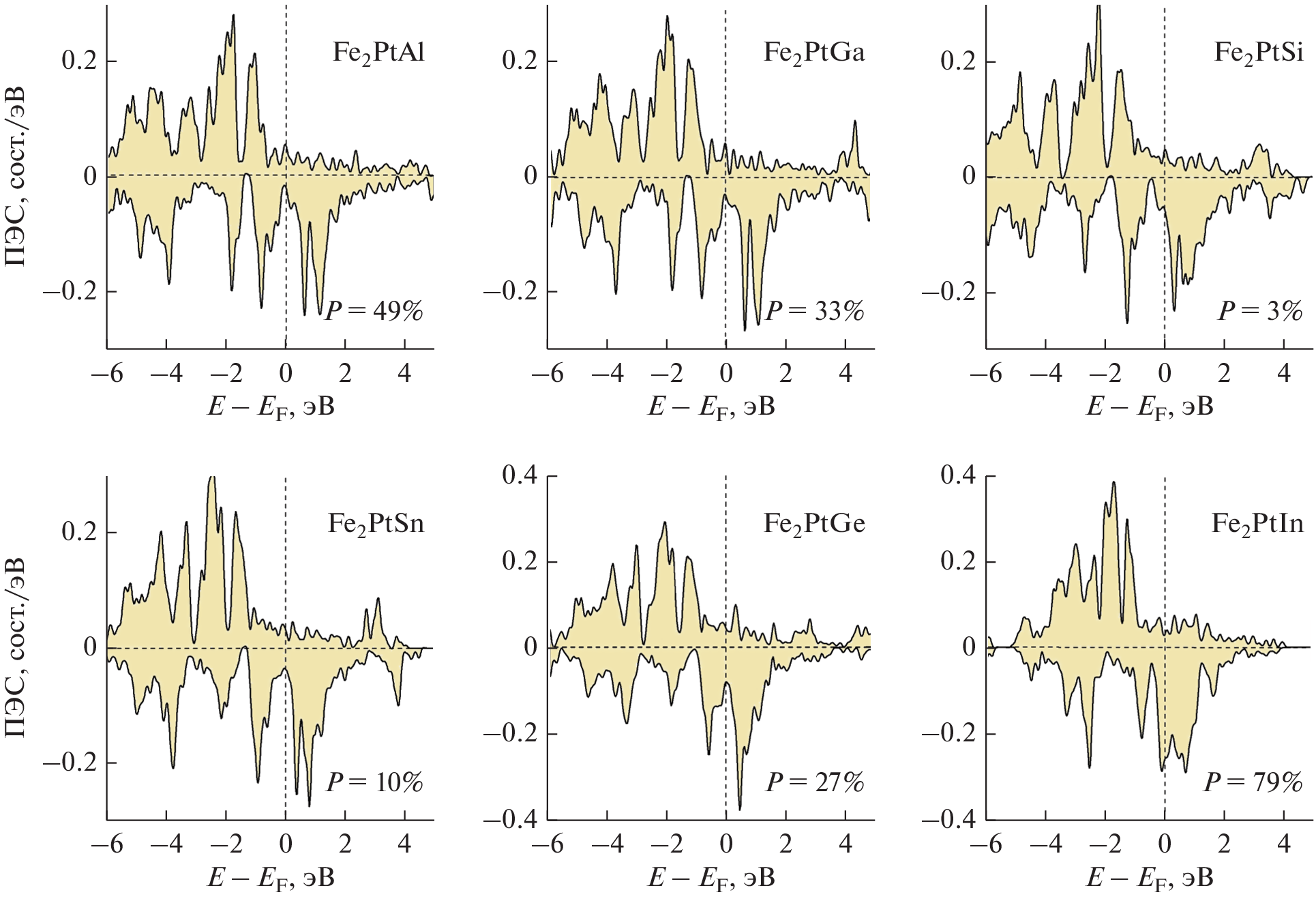 The properties of the ground state and the electronic structure of Fe2PtZ (Z = Ga, In, Ge, Si, Sn, Al) and FeRh1 – xPtx in the framework of the density functional theory implemented in the VASP software package alloys have been studied. Densities of electronic states for Fe2PtZ and FePt are obtained. It is shown that in Fe2PtIn and FePt high values of spin polarization are observed. It has been found that with increasing platinum concentration, the staggered antiferromagnetic spin configuration becomes unstable, and in the concentration range above 0.625, the antiferromagnetic configuration with layer-by-layer alternation of magnetic moment directions becomes advantageous. It was found that with a further increase in the platinum concentration, a ferromagnetic phase is observed.