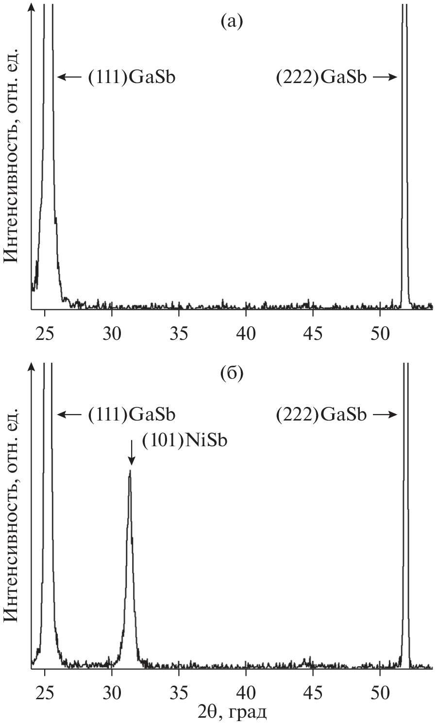 It was shown for the first time that when nickel is deposited onto a heated gallium antimonide substrate, diffusion of antimony atoms from the substrate into the growing film occurs and a nickel antimonide film is formed, which has an axial texture with an axis perpendicular to the film plane along the (101) direction.