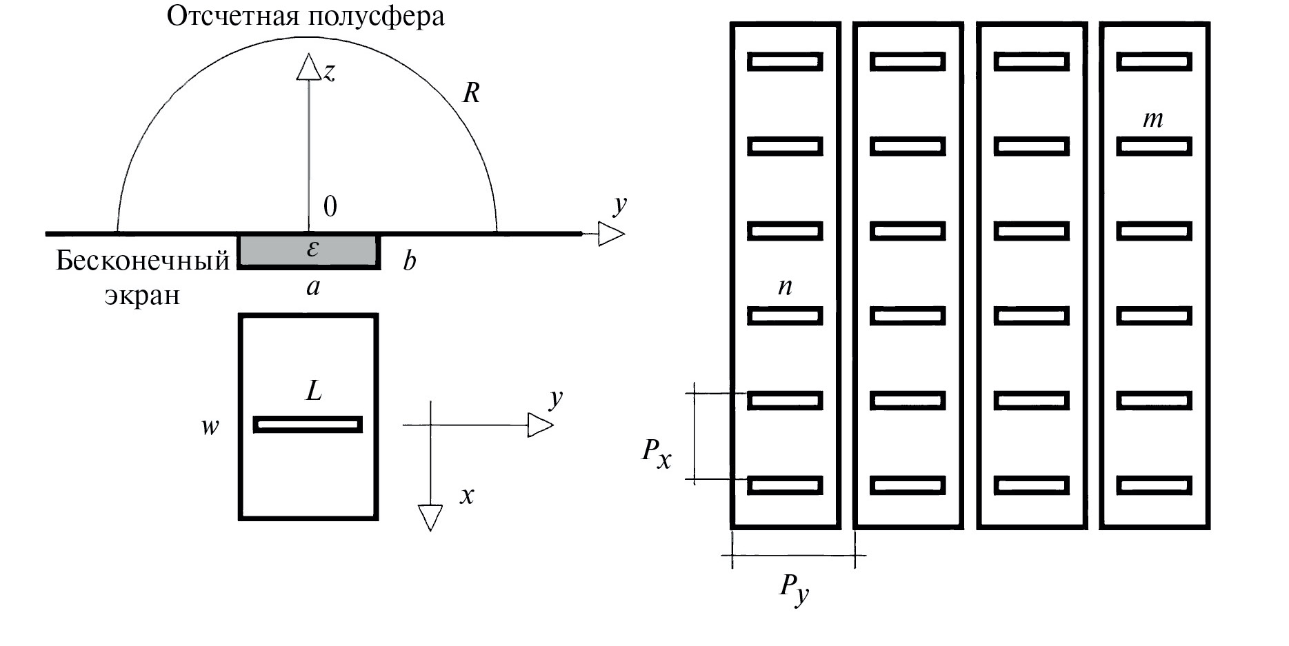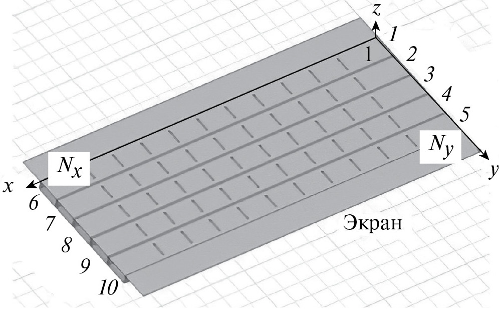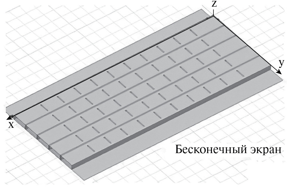 Как видно из рис. 5, модель с бесконечной плоскостью и, тем более, модель с конечным экраном (см. рис. 4) отличаются от решетки с бесконечным экраном, поскольку щели в бесконечной плоскости недопустимы. По этой причине плоскость расположена ниже волноводов при z = –b.