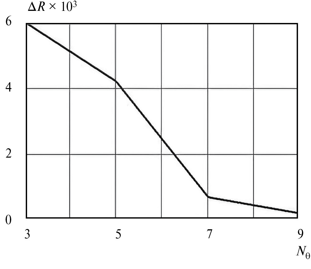 Выбор параметра nθ, определяющего количество СВ, является более сложной задачей. На первом этапе мы использовали для расчета МВ набор СВ, соответствующий nθ = 12. В этом случае общее количество СВ M = 96. Важно отметить, что в общем случае количество возбуждающих и рассеянных СВ может быть разным. В ходе численных расчетов мы выяснили, что одиночная щель, как и щель в решетке, возбуждает весьма ограниченный набор СВ. Доминирующие СВ соответствуют nθ = 1 и 3. Этот факт позволяет значительно сократить количество рассеянных СВ. Однако это не означает, что благодаря этому мы сможем сократить количество падающих СВ. Падающие СВ должны обеспечивать хорошую аппроксимацию поля возбуждения на отсчетной полусфере (см. рис. 1), и формально такое приближение может потребовать большого количества СВ.