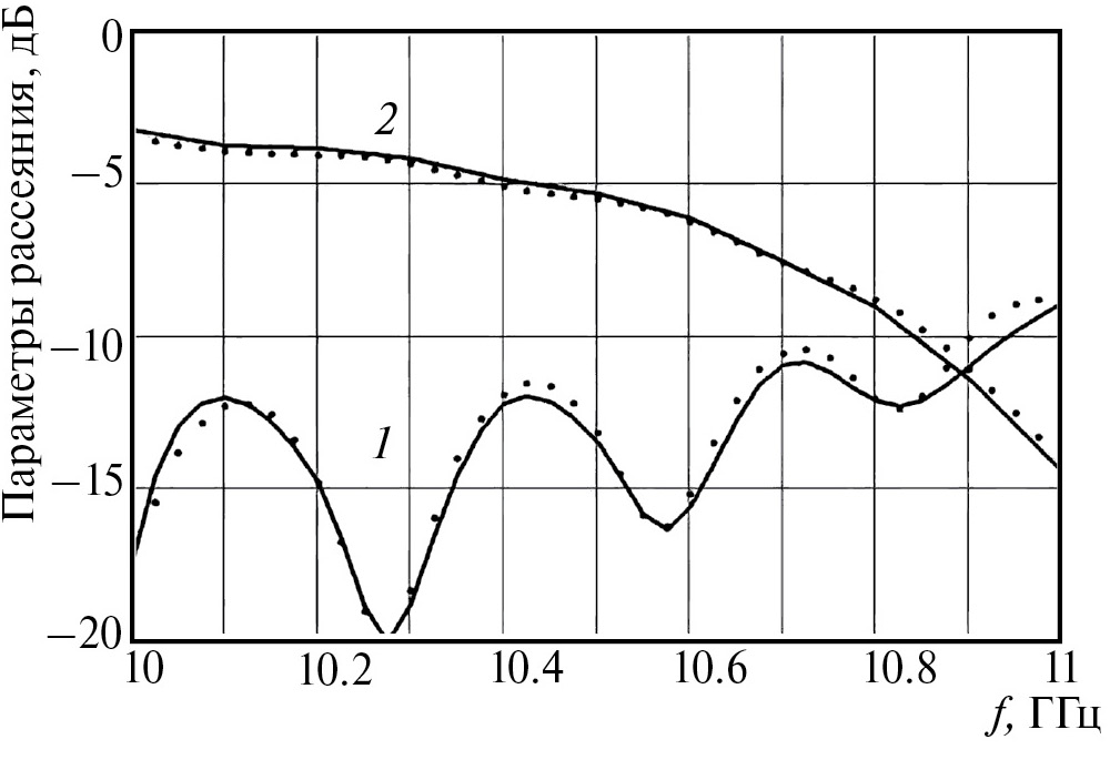 Коэффициенты отражения и пропускания (кривые 1,2) были определены для портов 3,8 (центральный волновод) с учетом одновременного возбуждения портов 1–5. Точки на рис. 6 соответствуют HFSS модели 1 (см. рис. 4) с экраном конечного размера. Параметры рассеяния HFSS модели 2 (бесконечная плоскость) практически совпадают с показанными на рис. 6 точками, поэтому их не приводим.