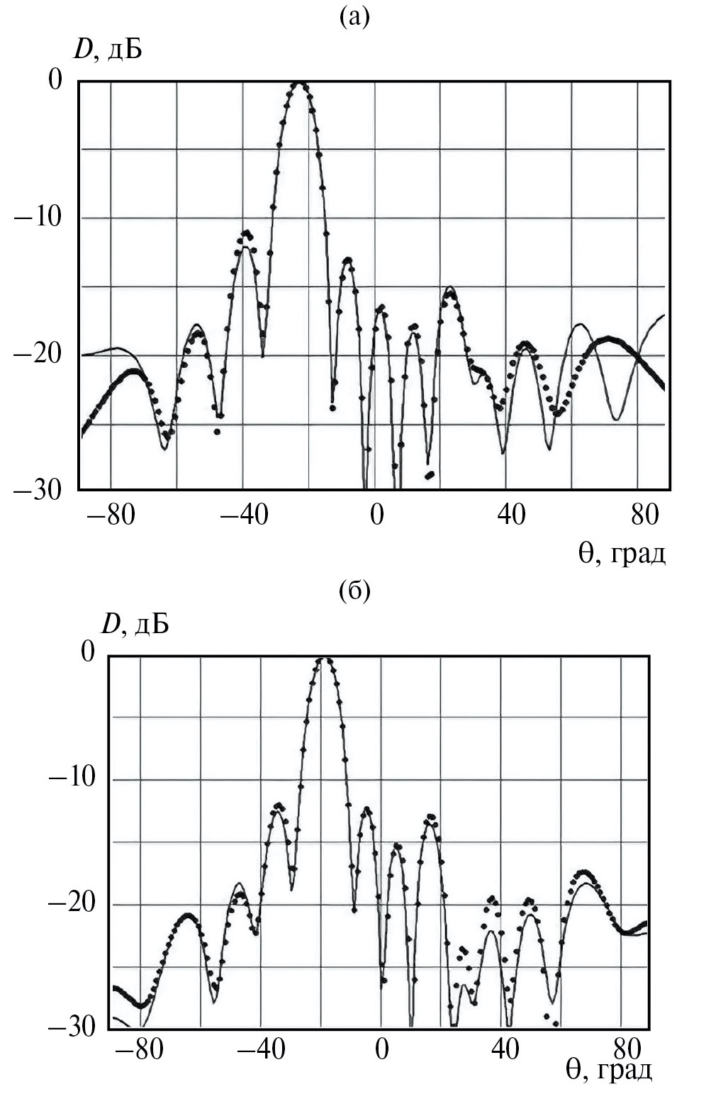 Нормированная ДН в угломестной плоскости (φ= 0, 180°) на частоте 10.4 ГГц показана на рис. 7a. Точки соответствуют модели 1. Хорошее соответствие между сплошной кривой и точками имеет место для главного луча и двух-трех боковых лепестков. Дальние боковые лепестки (θ = 60…90°), рассчитанные двумя методами, различаются. Эта разница может быть связана с влиянием экрана конечного размера.