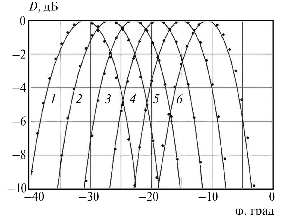 Рис. 9. Главный луч ДН на частотах f = 10 (1), 10.2 (2), 10.4 (3), 10.6 (4), 10.8 (5) и 11 ГГц (6); по методу ОМР-РСВ (сплошные кривые) и HFSS (точки).
