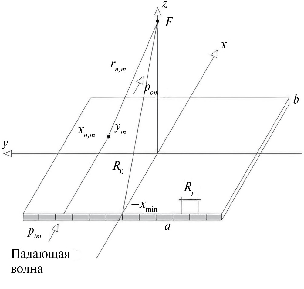 где φ0m – фаза падающей на порт pim-волны, γ0 – постоянная распространения волновода на частоте f0, k0 – волновое число свободного пространства на той же частоте, –xₘin – координата линии, на которой располагаются порты pim, R0 – расстояние от некоторой отсчетной точки до фокуса. Точка отсчета может быть выбрана произвольно. Как показано на рис. 10, она расположена в центре левой границы решетки.