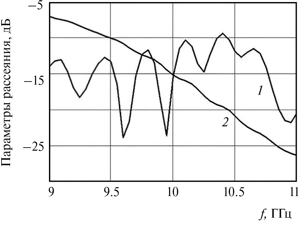 Рис. 12. Частотные зависимости параметров рассеяния: коэффициент отражения (1) и передачи волновода (2).