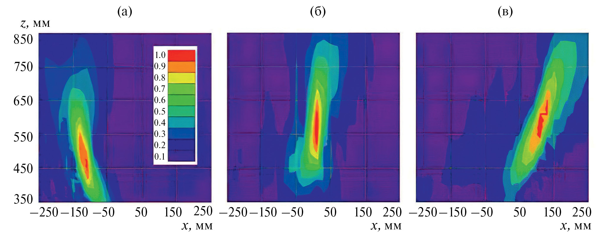 Рис. 13. Нормированные распределения электрического поля в плоскости XOZ на частотах 9 (a), 10 (б), 11 ГГц (в).Электрическое поле нормируется на максимальную напряженность электрического поля на частоте 10 ГГц.