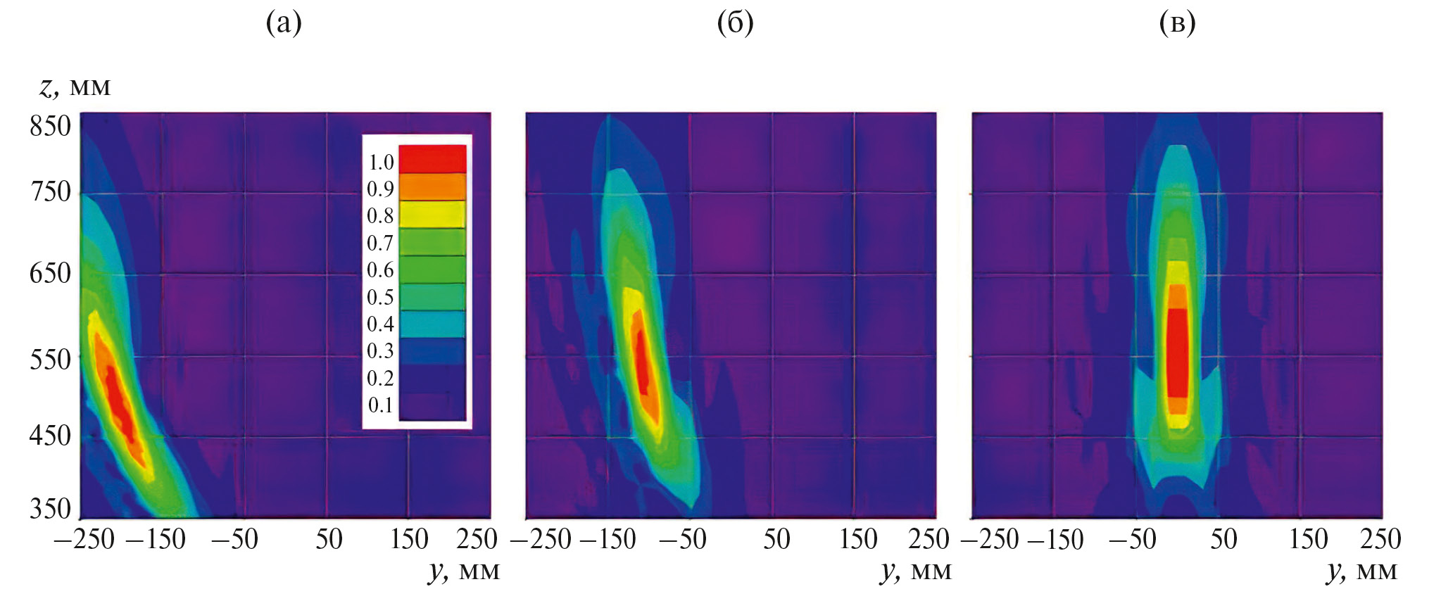 Рис. 16. Нормированное распределение электрического поля на частоте 10 ГГц в плоскости YOZ для углов α₀= 20° (a), 10° (б), 0° (в).