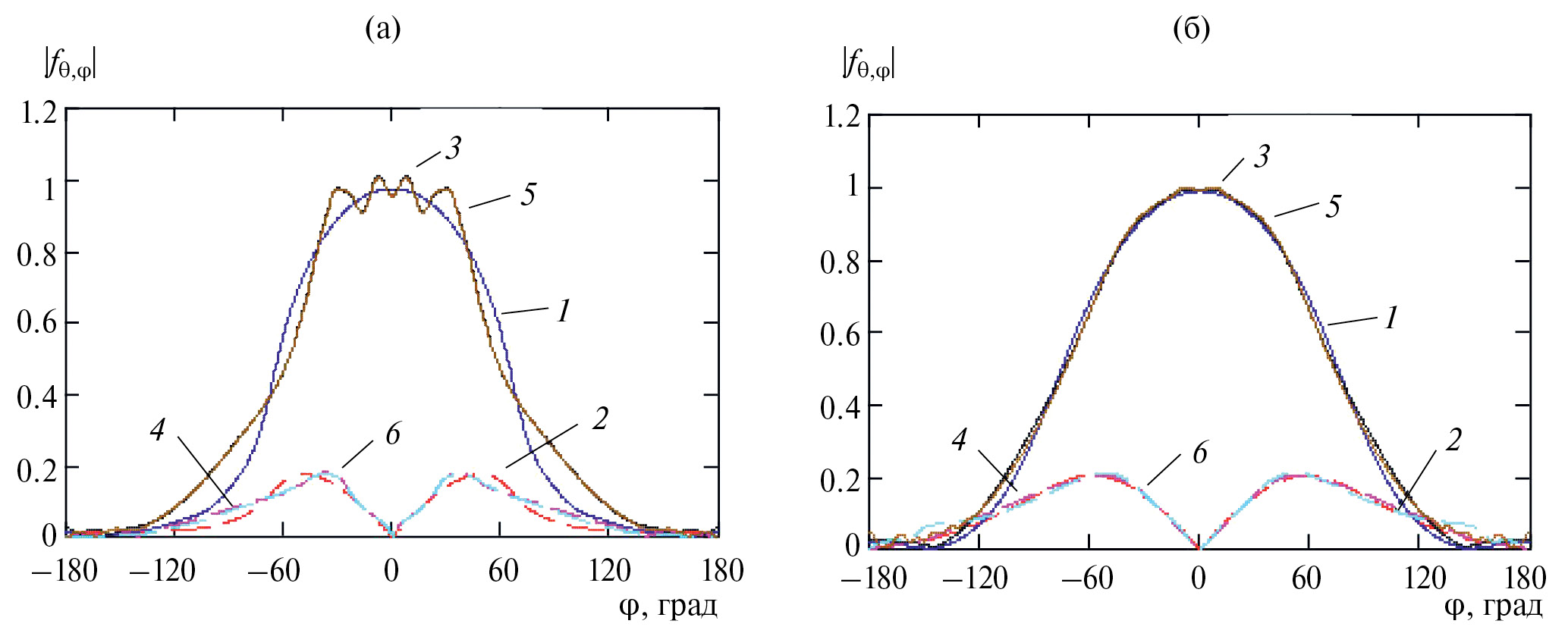 Рис. 4. Парциальная диаграмма аксиального щелевого элемента сферической антенной решетки, расположенного при ϑₙ = 72.3° (dᵩ = 0.986λ), для θ = 90° (а) и θ = 60° (б) для φ-поляризации (1, 3, 5) и θ-поляризации (2, 4, 6): 1, 2 – пространственная волна (8); 3, 4 –асимптотика интегралов (32); 5, 6 – асимптотика и ДПФ (46).