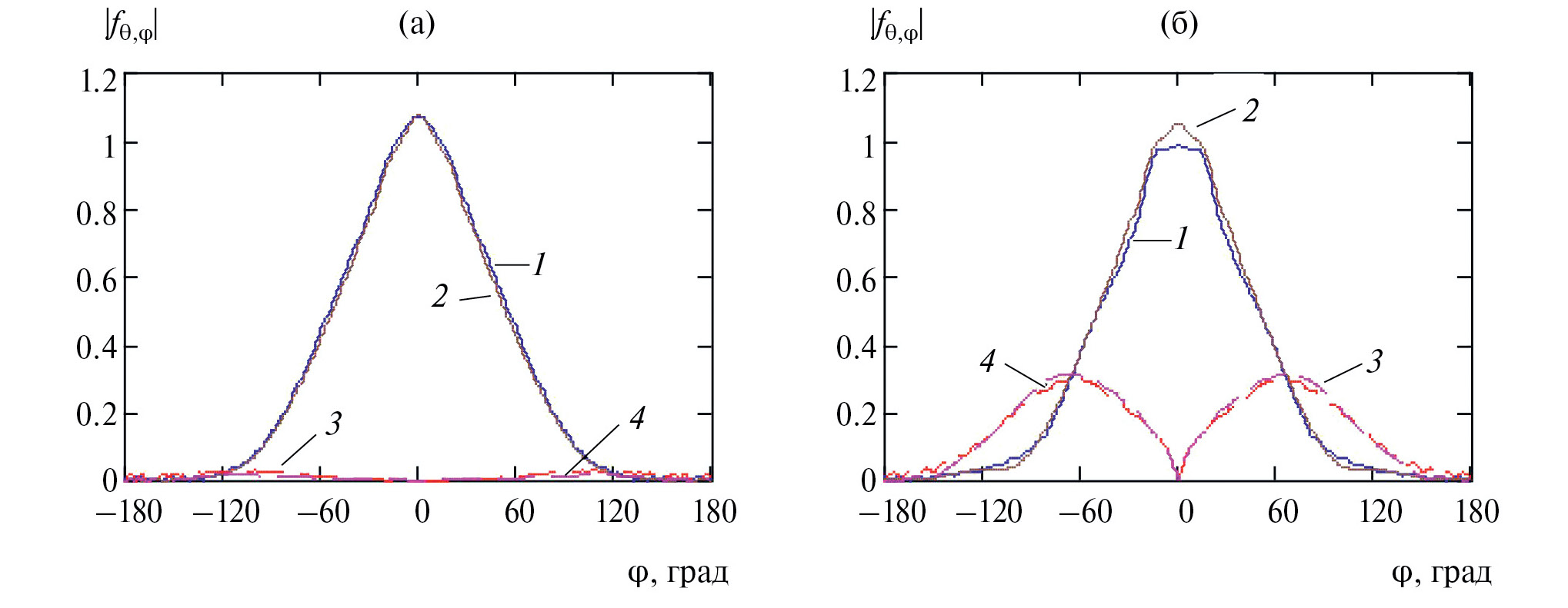 Рис. 5. Парциальная диаграмма азимутального щелевого элемента конической антенной решетки при θ = 90° (а) и θ = 60° (б) для φ-поляризации (1, 2) и θ-поляризации (3, 4): 1, 2 – строгий метод; 3, 4 –асимптотика и ДПФ (46).