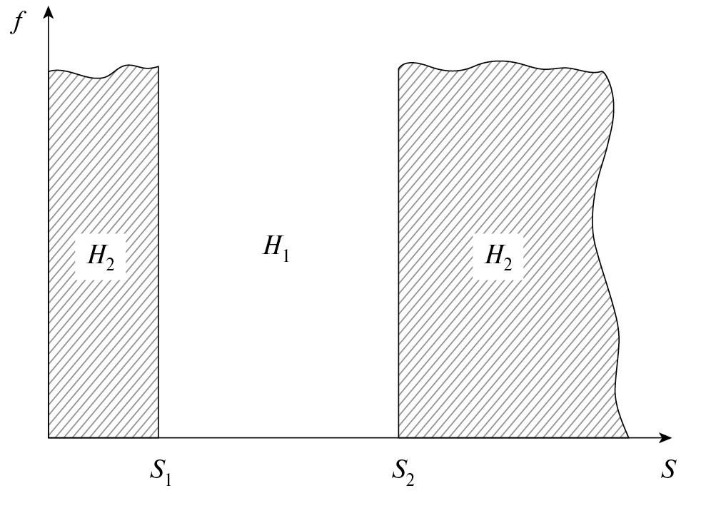 Рис. 2. Области принятия гипотез для оптимального решающего правила; область принятия гипотезы заштрихована.
