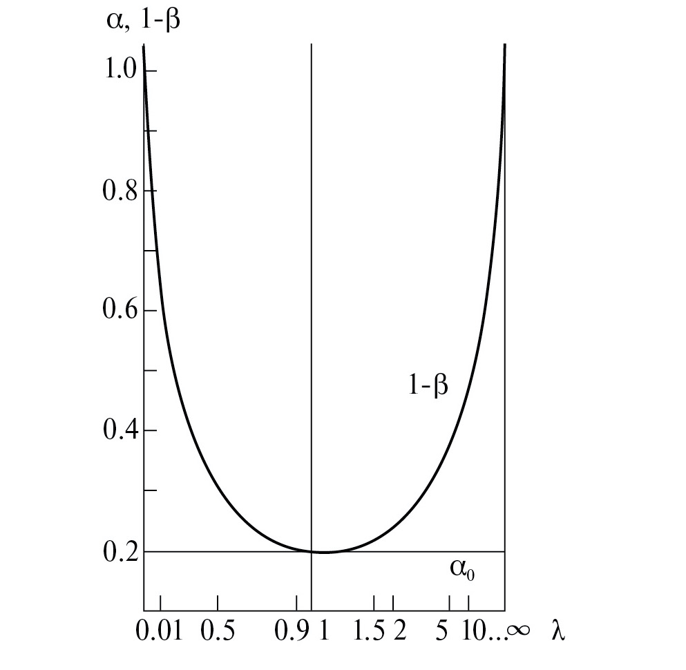 Отметим, что при на оси абсцисс откладывается величина 2 – 1/λ. Ясно, что найденное решающее правило является подобным уровню и несмещенным.