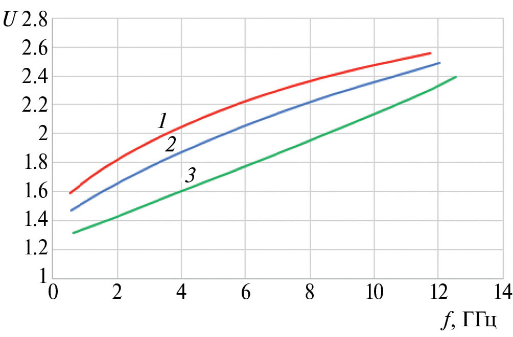 Рис. 5. Дисперсионные характеристики спиральной линии при p = 5 мм, Ds = 4 мм, Dw = 0.5 (1), 1 (2), 2 мм (3).