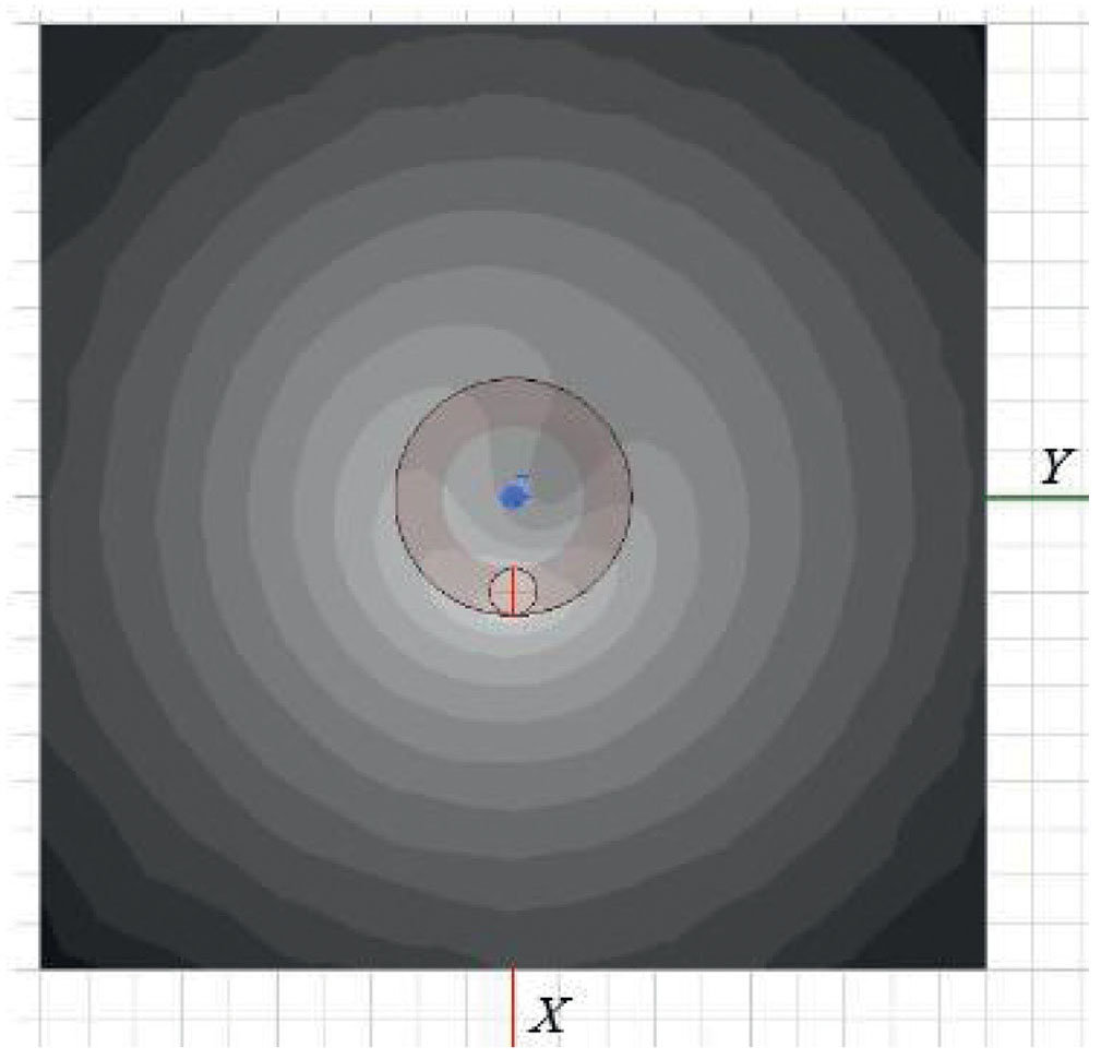 Рис. 6. Мгновенное распределение амплитуды напряженности электрического поля поверхностной волны спирали в поперечной плоскости XOY на частоте 9.633 ГГц.
