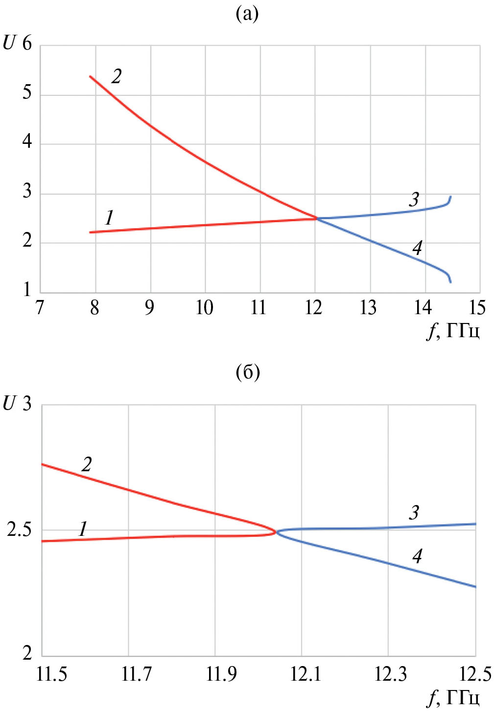 Рис. 7. Дисперсионная характеристика спиральной линии в широком диапазоне частот (а) и в узкой окрестности запрещенной зоны (б) при p = 5 мм, Ds = 4 мм, Dw = 1 мм: прямая (1) и обратная волны (3) и соответствующие им встречные волны (2) и (4).