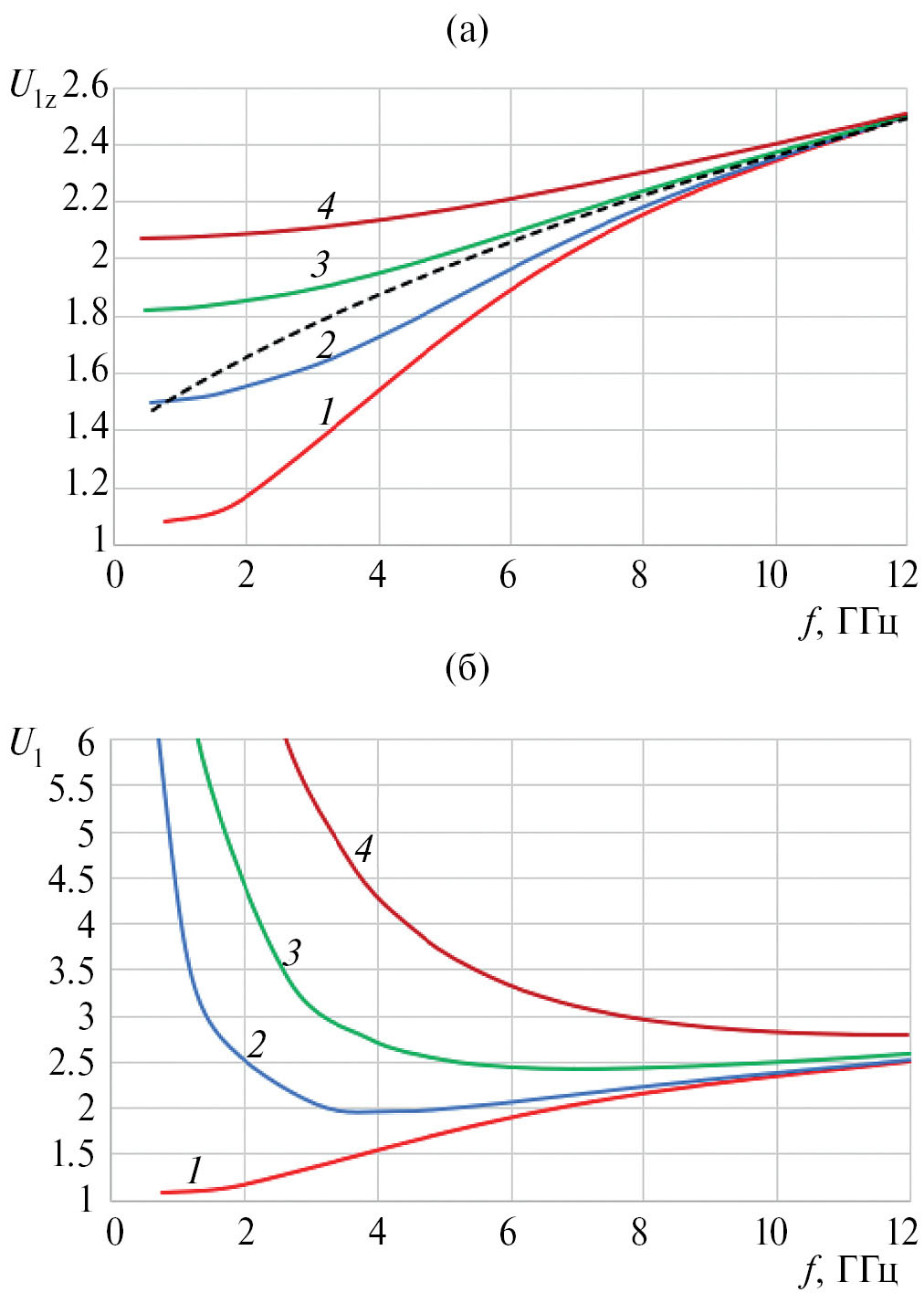 Рис. 10. Дисперсионные кривые для первой собственной волны в линейной решетке спиральных линий при δφy = 0° (1), 45° (2), 90° (3) и 180° (4): а – замедление относительно осей линий, б – полное замедление; штриховая кривая – дисперсия одиночной линии.