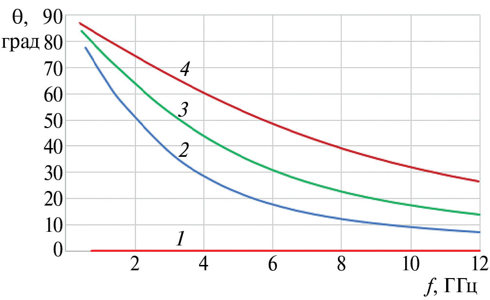 Полученные значения замедления вдоль осей z и y позволяют определить направление распространения собственных волн в плоскости решетки y0z. На рис. 13 приведены частотные зависимости угла распространения относительно осей линий (ось z) для основной волны, рассчитанные по формуле θ = arctg(U1y/U1z). В синфазной решетке направление распространения волны совпадает с осью z (θ = 0) и не зависит от частоты. При сдвиге фазы между линиями с ростом частоты направление распространения волны приближается к оси z тем быстрее, чем меньше величина фазового сдвига.