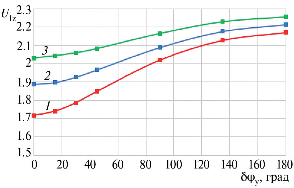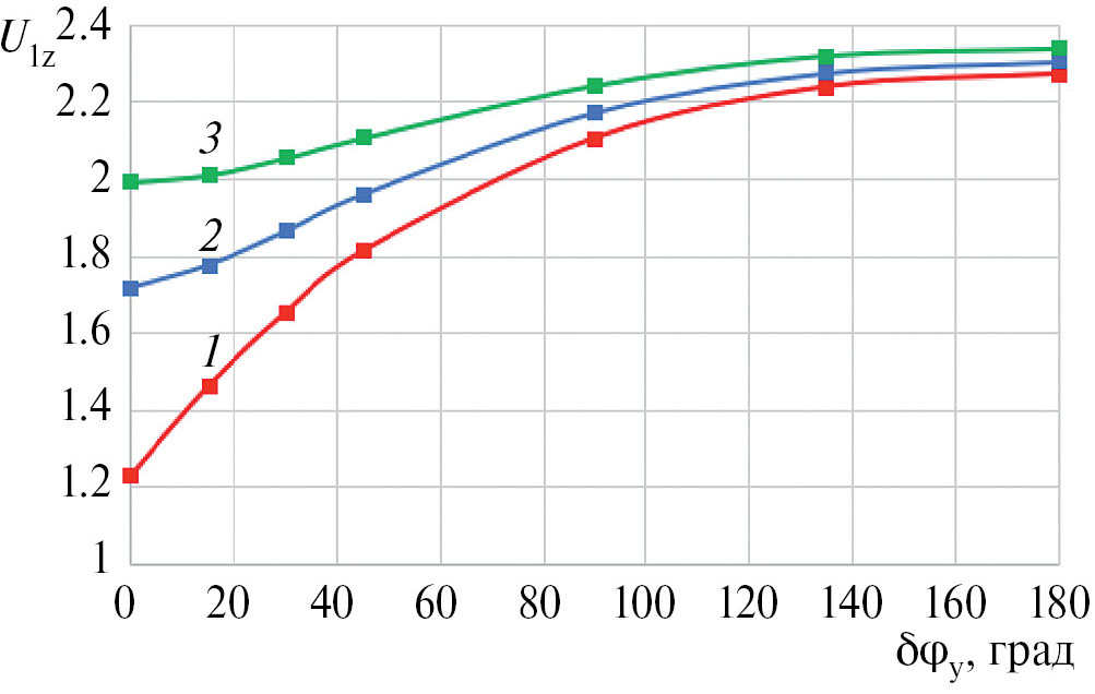 Как отмечалось выше, с точки зрения исследования возможности применения решетки спиральных линий в облучателях кластерного типа интерес представляют зависимости величины замедления вдоль осей линий U1z от разности фаз между линиями при заданной частоте (рис. 14). На рисунке отмечены значения замедления при δφy = 0°, 15°, 30°, 45°, 90°, 135° и 180° (темные квадраты), а кривые построены как сплайн-аппроксимации по этим семи значениям. Расчеты показывают, что зависимости U1z (δφy) на рис. 14 являются четными относительно значения δφy = 0°. Из рисунка следует, что на заданной частоте величина замедления основной волны вдоль осей спиральных линий монотонно растет с ростом фазового сдвига между ними. Скорость возрастания зависит от частоты: чем выше частота, тем зависимость становится более пологой.