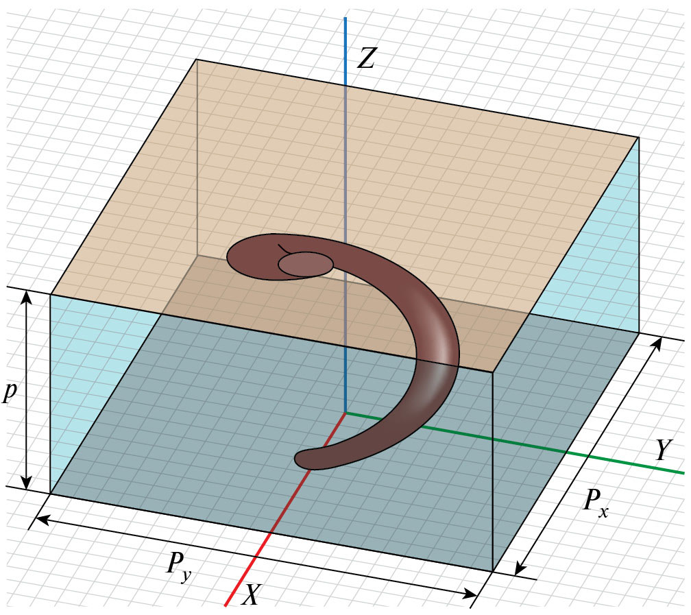 Рис. 9. Модель единичной ячейки для линейной периодической решетки спиральных линий.