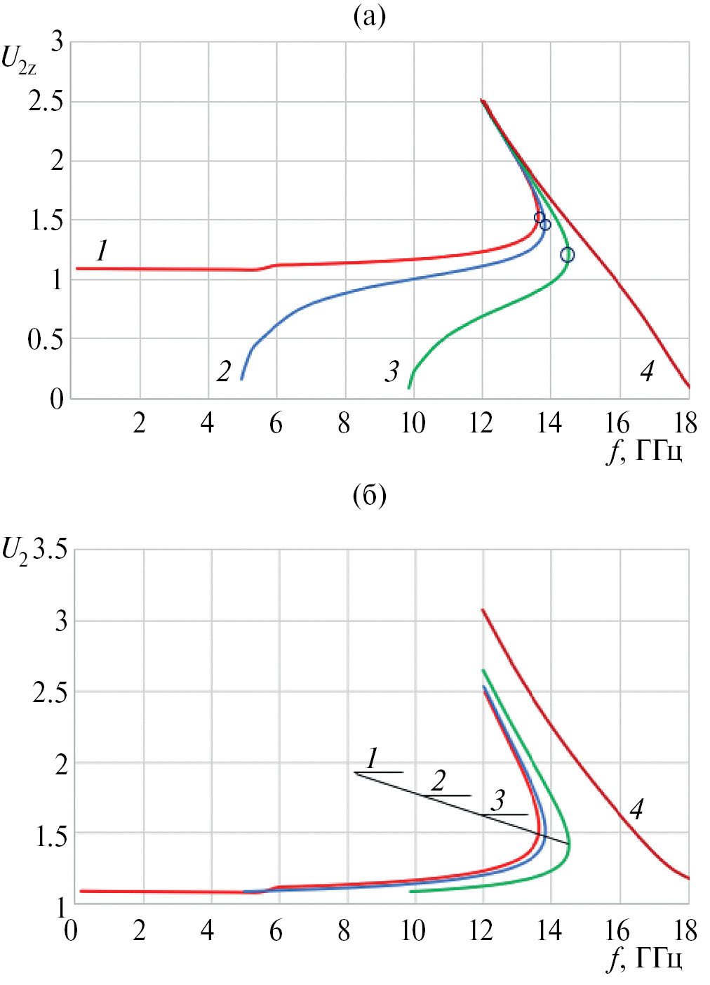 Рис. 11. Дисперсионные кривые для второй собственной волны в линейной решетке спиральных линий при δφy = 0° (1), 45° (2), 90° (3), 180° (4): а – замедление относительно осей линий, б – полное замедление; светлые кружки на рис. (а) – точки перегиба.