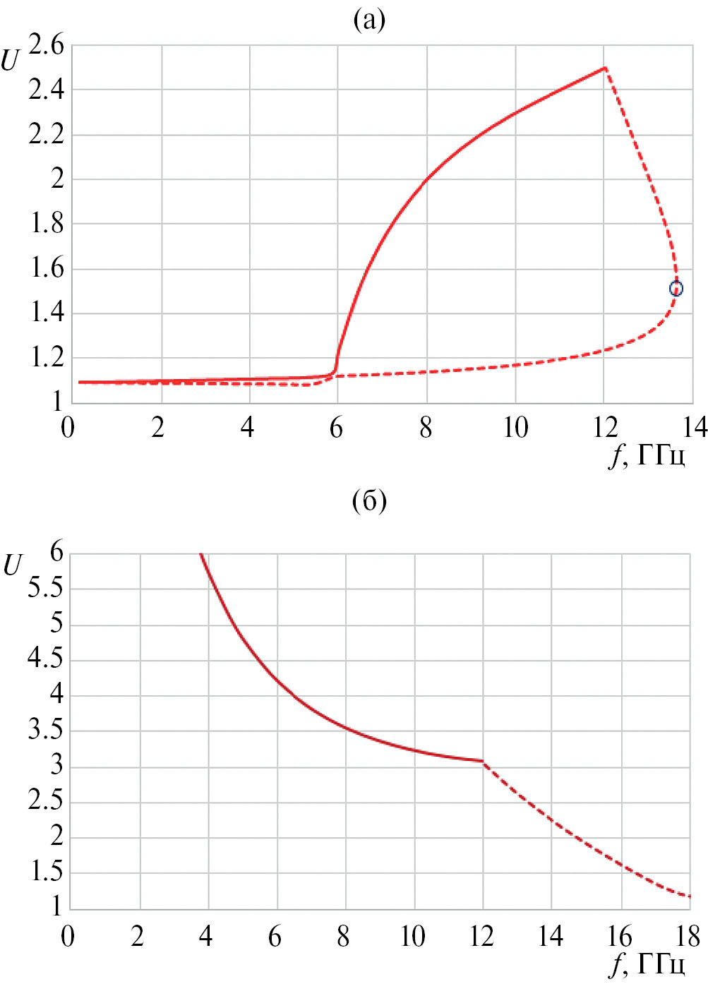 Рис. 19. Зависимости полного замедления первой (сплошные кривые) и второй (штриховые) собственных волн двумерной решетки от частоты при δφ = 0° (а) и 180° (б); светлый кружок на рис. (а) – точка перегиба.