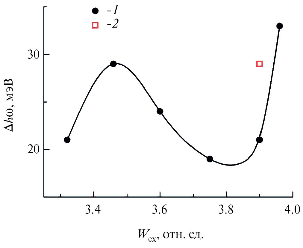 Рис. 3. Ширина спектрального диапазона Δħωs, в котором заключены существенно модулированные зависимости Ws(δY), в функции Wex для измерений в максимуме (1) и на периферии (2) диаграммы направленности излучения.
