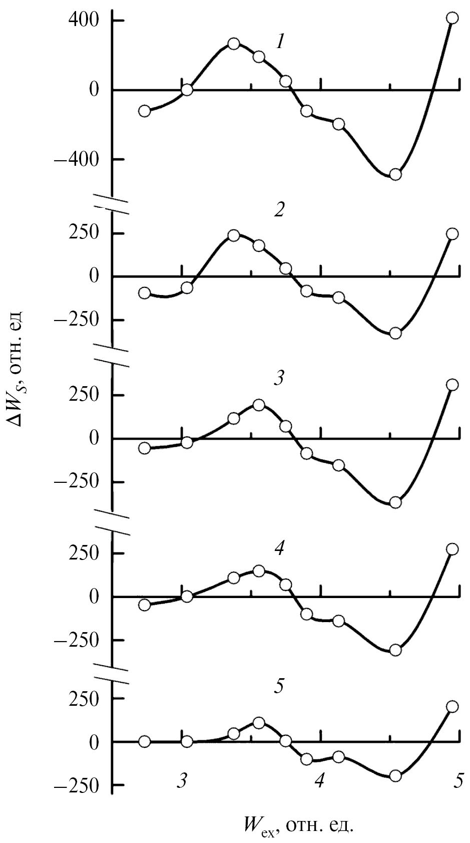 То, что при изменении Wex менялся характер модуляции зависимости WΣ(δY) заставило предположить, что и зависимость WΣ(Wex) при δY = const должна быть модулированной. Это действительно экспериментально обнаружилось (рис. 4). Измеренная зависимость может быть представлена как сумма её немодулированной составляющей (пунктирная прямая) и модуляционной составляющей, представляемой разностью экспериментальной зависимости и указанной пунктирной прямой. Полученные модуляционные составляющие ΔWs(Wex) измеренных зависимостей энергии спектральных компонент излучения Ws(Wex) иллюстрирует на отдельных примерах рис. 5. Максимум и минимум на графиках ΔWs(Wex) соответствуют, как будет показано ниже, РР.