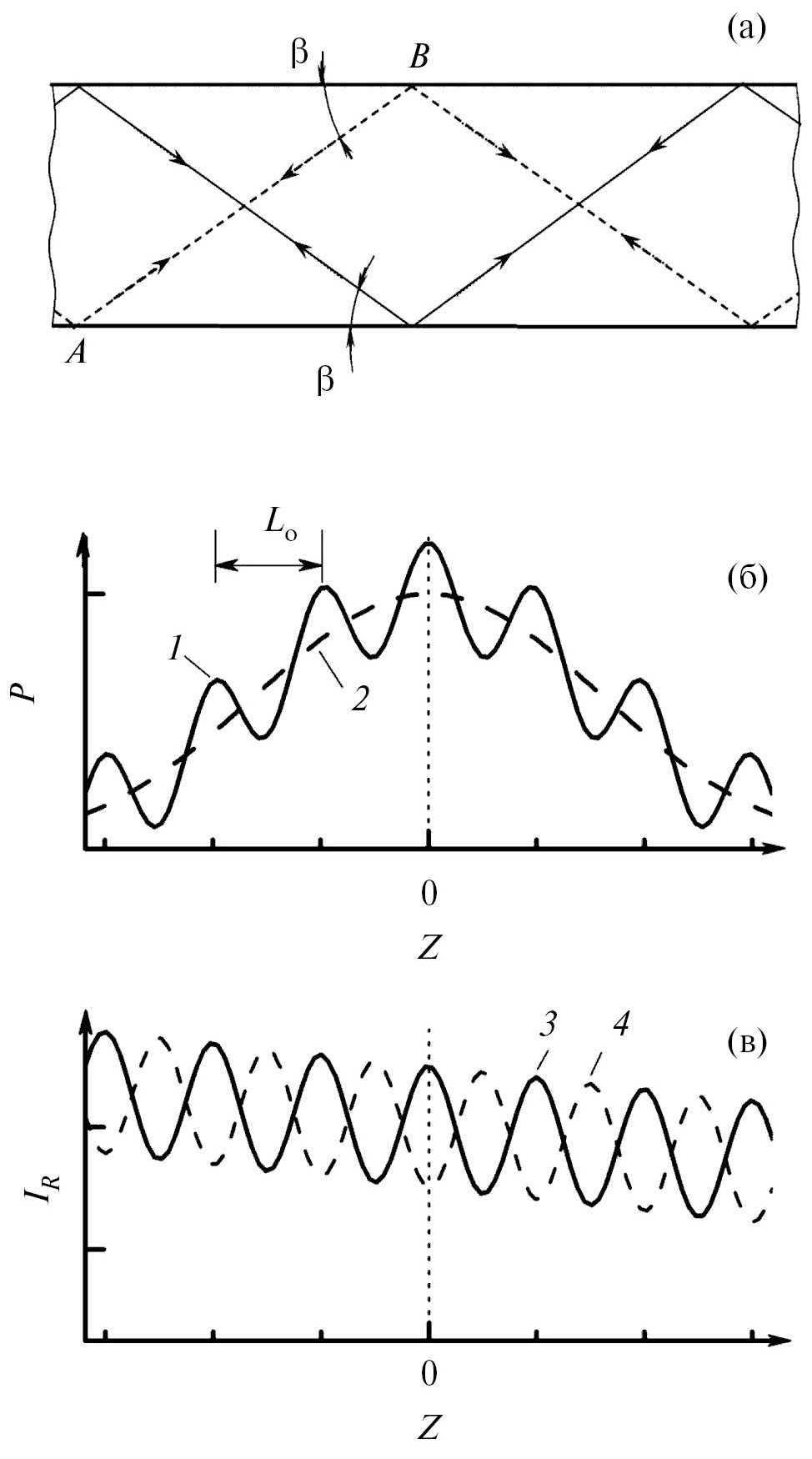 Примем для оценки, что k = 1, λ0 = 0.886 мкм для спектральной моды с энергией фотона ħω0 = 1.40 эВ, n0 = 3.6 для GaAs при температуре решетки TR ≈ 300 K, d = 1.5 мкм. Получаем β ≈ 4.7°, ξ ≈ 9.4 мэВ. Упомянутое выше граничное условие образования РБО состоит в следующем. Каждой точке пересечения одной z-траектории с гетерограницей соответствует симметрично расположенная точка пересечения второй z-траектории с другой гетерограницей, так что обе указанные точки лежат на противоположных концах нормали к гетерограницам. Это условие беспрепятственно выполняется до того момента, пока отраженное от торца излучение не поступит в активную область. Допустим, что точка пересечения двух симметричных зигзагообразных z-траекторий излучения – последняя точка перед его выходом через торец наружу – не располагается в плоскости торца. Тогда отраженное излучение будет двигаться в активной области, усиливаясь, в направлении от торца уже по другим, новым траекториям. И эти траектории будут пересекаться с гетерограницами в новых точках, отличающихся от установившихся до прихода отраженного излучения. И эти новые точки уже не лежат на одной нормали с точками пересечения с гетерограницами излучения, двигающегося в направлении к торцу.
