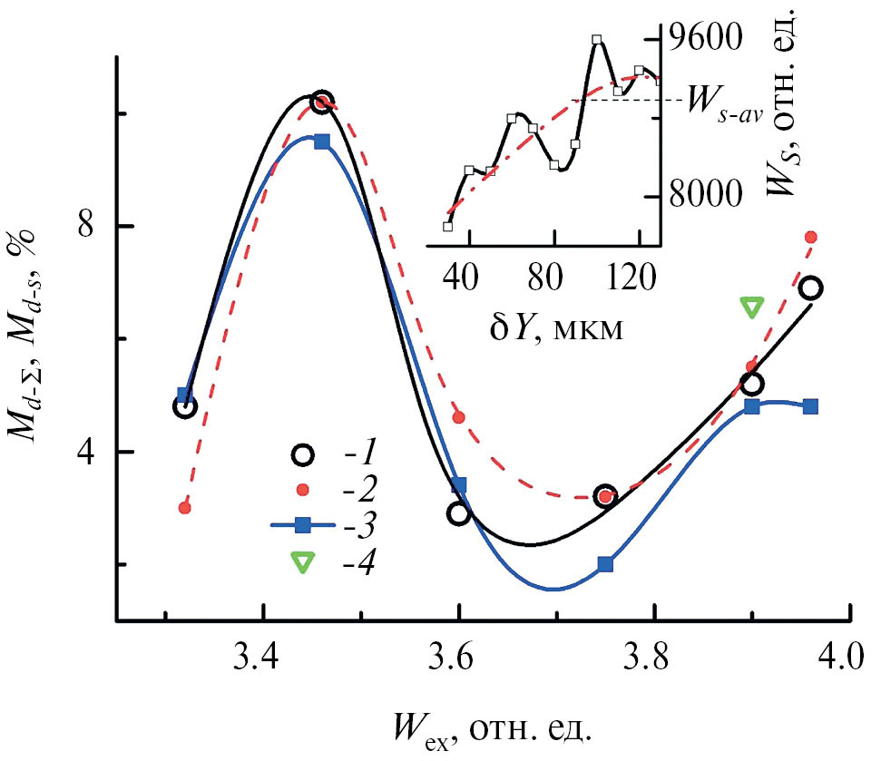 Рис. 7. Изменение с Wex максимальной относительной величины Md-Σ модуляции зависимости WΣ(δY) для измерений в максимуме (1) и на периферии (4) диаграммы направленности; то же, но для глубины Md-s зависимости Ws(δY) спектральной компоненты излучения с ħω = 1.387 (2) и 1.384 эВ (3). На вставке: фрагмент зависимости Ws(δY) – сплошная кривая; её гладкая составляющая – штрихпунктир; определение энергии Ws-aν для формулы (6) – пунктир.