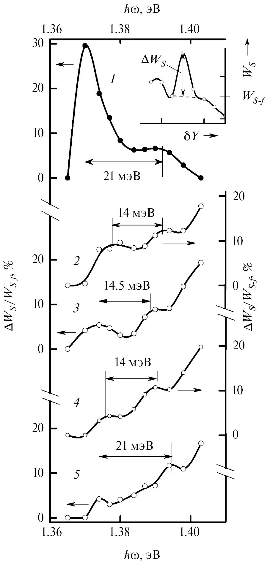 Спектры относительной высоты ЛВ на зависимости Ws(δY) при тех фиксированных δY и Wex, при которых возникал резонанс, представлены на рис. 8. Относительную высоту ЛВ характеризует отношение ΔWs/Ws-f, где ΔWs – высота ЛВ, а Ws-f – энергия спектральной компоненты излучения на уровне основания ЛВ (см. рис. 8, вставка). Эти спектры оказались модулированы так, что интервал между выступами составлял Δħω = 21 мэВ (кривые 1 и 5) или 14 мэВ (кривые 2–4), что связано с δY (объяснение см. ниже).