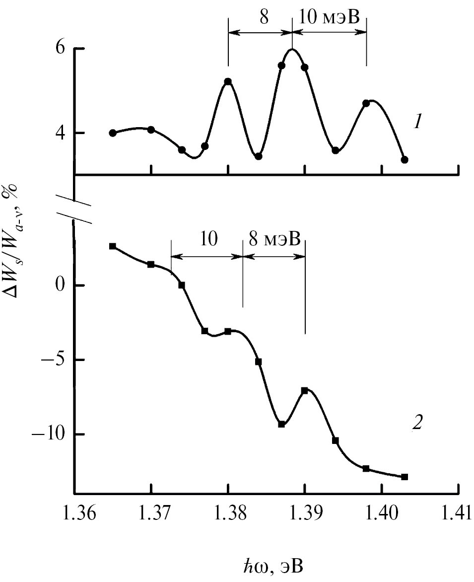 Спектры ΔWs/Ws-aν = f(ħω) (рис. 9) характеризуют относительную величину модуляции зависимостей ΔWs(Wex) (см. рис.5) в максимуме при Wex ≈ 3.38 отн. ед. и минимуме при Wex ≈ 4.54 отн. ед. Энергия Ws-aν определялась аналогично показанному на вставке к рис. 7. Эти спектры модулированы с периодом Δħω= 8…10 мэВ, близким к приведенной выше оценке периода ξ модуляции спектра излучения, создаваемой РБО при k = 1. С таким периодом были модулированы благодаря РБО и экспериментальные мгновенные спектры излучения в [2].