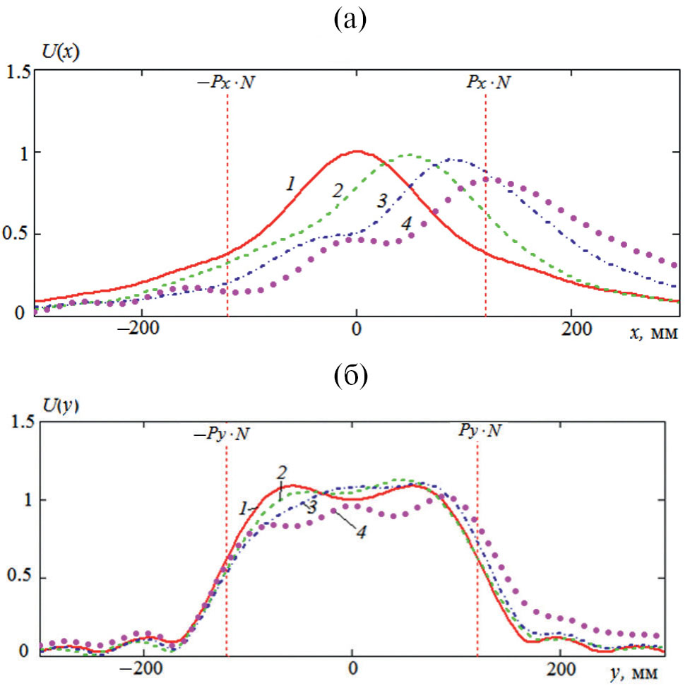 Из данных, представленных на рис. 4–6, можем сделать вывод, что распределение поля в выходной апертуре решетки существенно отличается от распределения поля на входах элементарных излучателей, которое задается функциями An0, Am0. При этом можно выделить два вида искажений: искажение формы амплитудного распределения и его смещение. Второй эффект имеет место только при сканировании и зависит от угла отклонения θ.