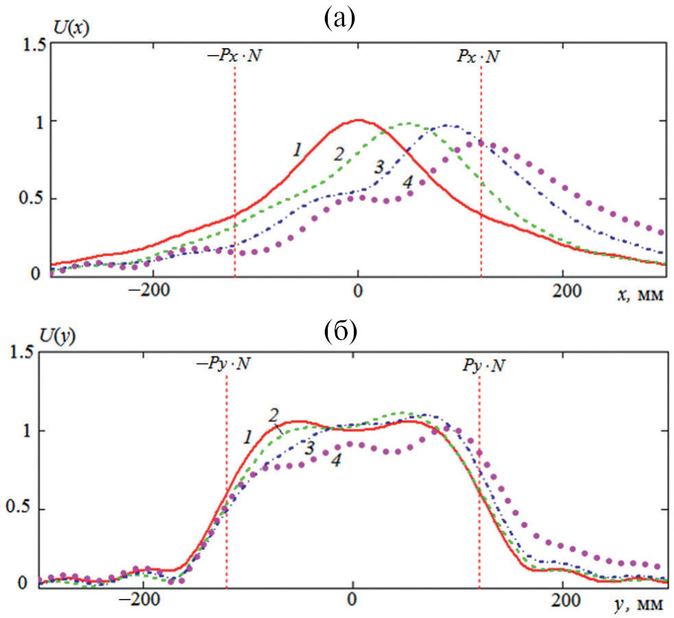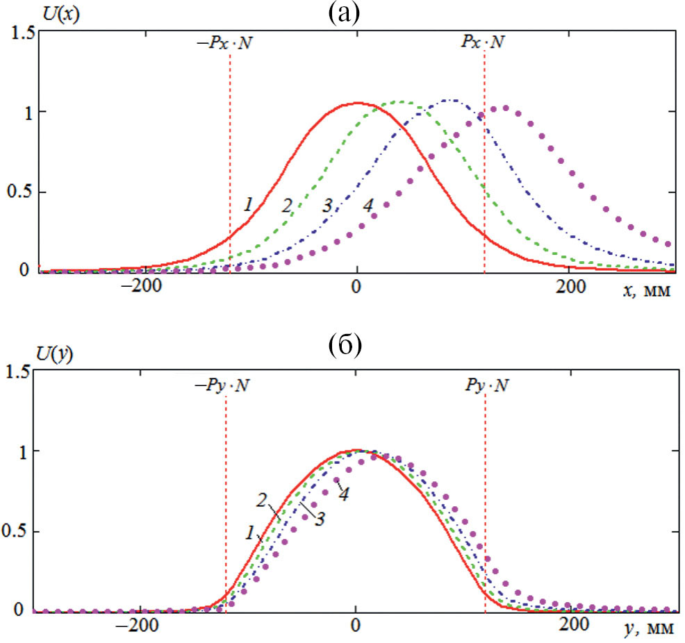 Рис. 7. Напряженность поля для кластера ТЕМ-рупоров с косинусоидальным амплитудным распределением на частоте 5 ГГц: отклонение луча 0 (1), 15 (2), 30 (3) и 45 град (4), сканирование в Н- (а) и Е-плоскости (б).