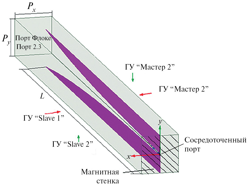 Исследуем кластер ТЕМ-рупоров, конечный по одной оси и бесконечный по другой со следующими параметрами: длина элемента решетки L = 180, а величины периодов решетки в Е- и Н-плоскости равны соответственно Py = 15 и Pх = 15 (см. рис. 2), причем период рассматриваемой решетки меньше половины длины волны. Здесь и далее все размеры приводятся в миллиметрах. Реализован экспоненциальный закон зависимости волнового сопротивления в сечении канала Флоке от координаты 0z. Отметим, что на продольных стенках ячейки установлены специальные граничные условия “Master–Slave” (см. рис. 2), поперечная стенка на границе пустого канала представляет собой порт Флоке, который имеет две моды, соответствующие двум поляризациям. Поперечную стенку вблизи сосредоточенного порта объявляем магнитной, что соответствует холостому ходу в терминах линии передачи, или идеальному частотно независимому резонатору. Такой подход позволяет нам не учитывать частотную зависимость системы возбуждения, которое на практике весьма велико в таких структурах и оказывает заметное влияние на характеристики решетки. Импеданс порта 1 равен Zc1 = 25 Ом, импеданс пустого канала (волновода Флоке) при этом равен 377 Ом. Пусть количество элементов в кластере равно 2N + 1 = 17, при этом обеспечивается равномерное амплитудное распределение.
