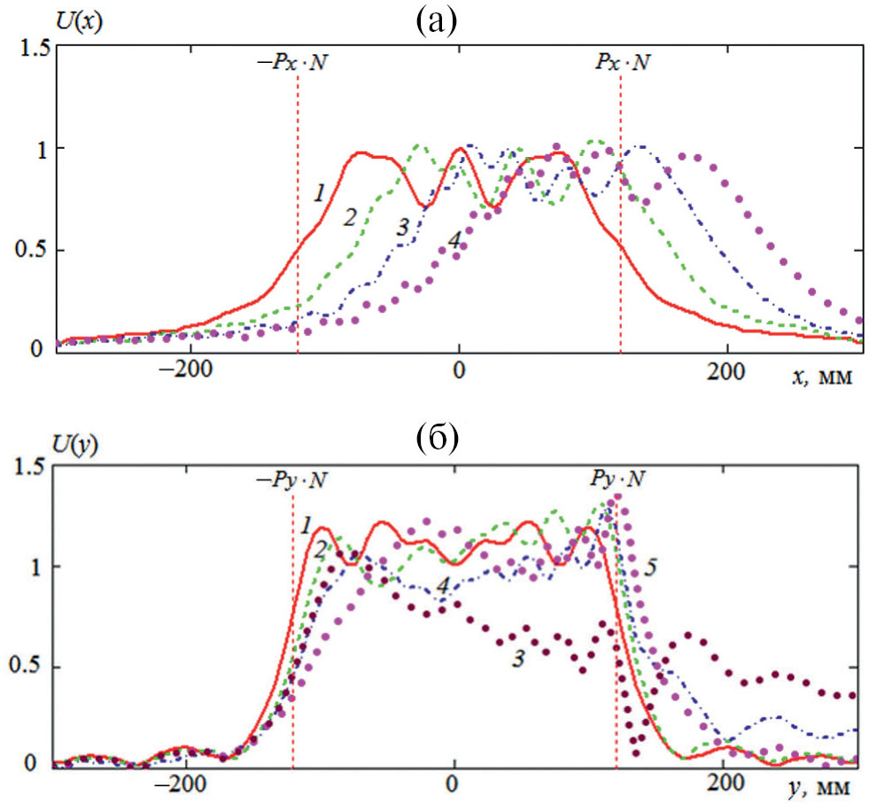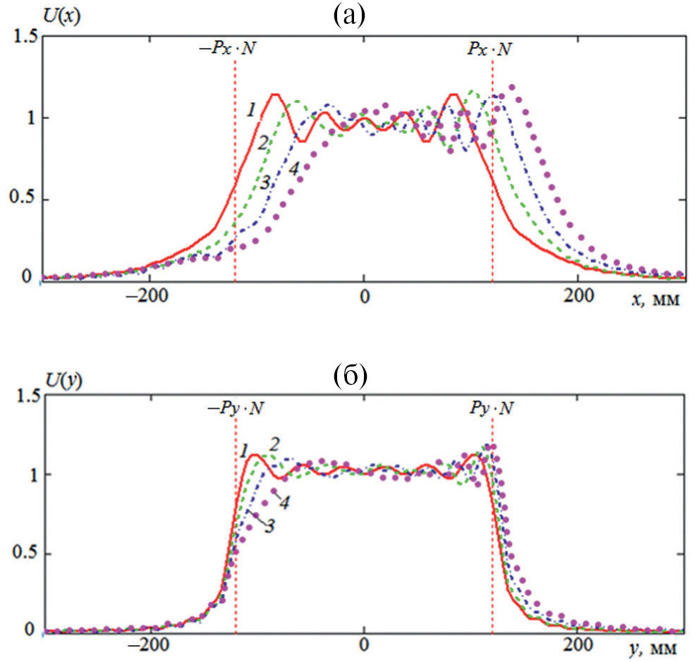 Также необходимо отметить существенно разное поведение поля в плоскостях Е и Н. Искажения формы и смещение в Н-плоскости проявляются значительно сильнее, чем в Е-плоскости. При этом искажения формы в Н-плоскости имеют характер “расплывания”, которое проявляется в том, что поле выходит за границы кластера. Кроме того, наблюдается также эффект “сглаживания”, который выражается в исчезновении резких границ области, занятой полем. Особенно сильно эти эффекты выражены на низких частотах (см. рис. 4а,4б). В Н-плоскости они привели к изменению формы амплитудного распределения от прямоугольной на входе в решетку до колоколообразной на выходе из нее. С повышением частоты указанные эффекты остаются, но выражены уже не столь сильно.
