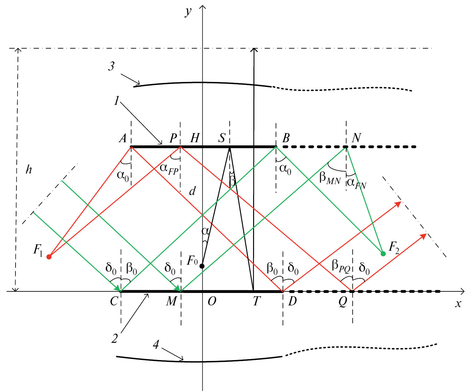 Предположим, что луч из фокуса F1 попадает в точку M (yM ≠ 0), которая находится на границе начального участка решетки 1. После отражения в точке М луч проходит через точку N, лежащую на границе начального участка решетки 2. Лучевой вектор отраженного от решетки 1 луча имеет вид