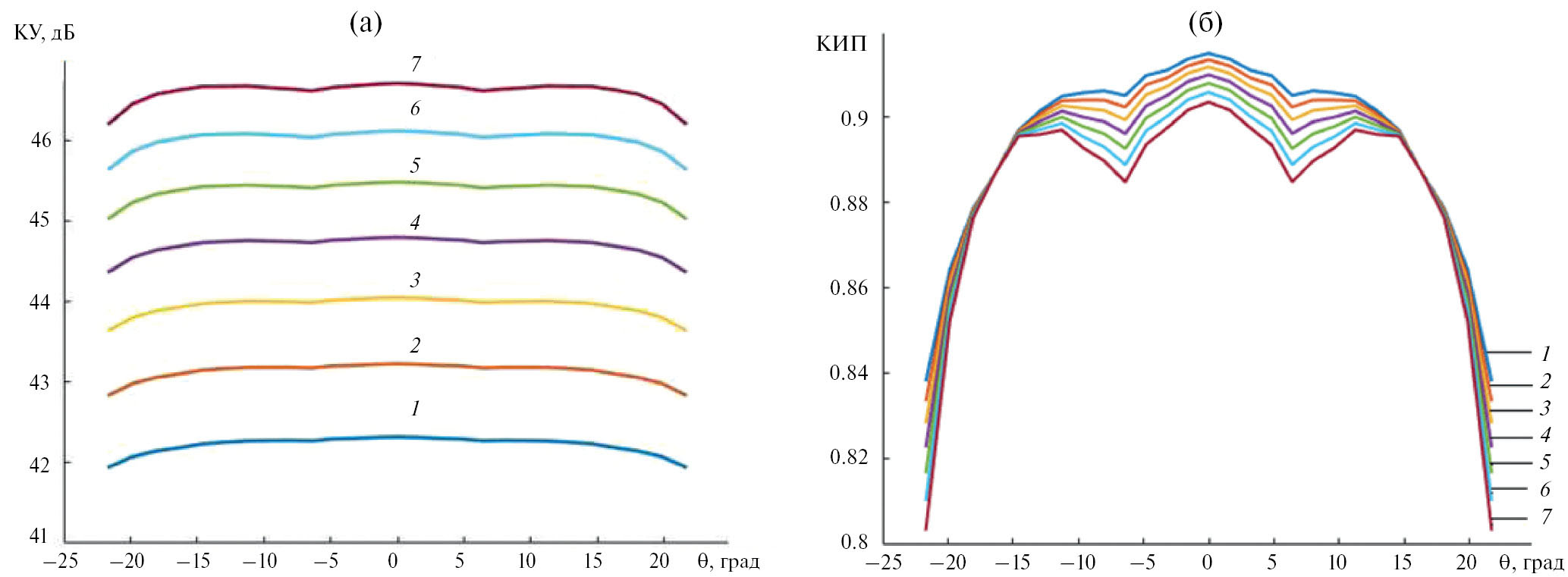 Рис. 8. Зависимости коэффициентов усиления (а) и апертурного КИПа (б) от угла зрения на частотах: 18 (1), 20 (2), 22 (3), 24 (4), 26 (5), 28 (6) и 30 ГГц (7).