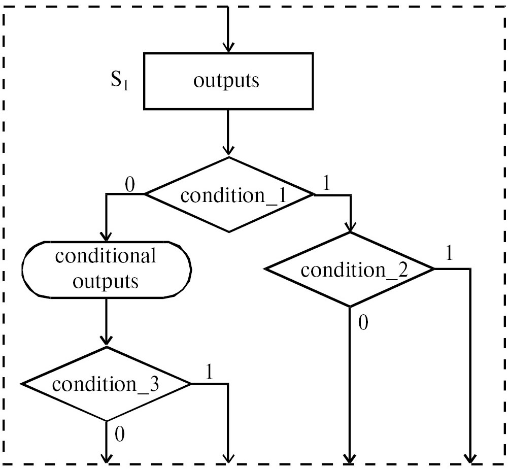 Вблизи вершины состояния записывается имя состояния FSMD (например, S1). В случае FSMD типа Мура внутри вершины состояния (прямоугольника) записываются операции, выполняемые в данном состоянии FSMD (outputs). В случае FSMD типа Мили в вершинах выхода по условию (овалах) записываются операции, выполняемые на данном переходе FSMD (conditional outputs). В условных вершинах (ромбах) записываются логические выражения (condition_1, condition_2, …). Выходы условной вершины обозначаются значениями 0 и 1, которые соответствуют переходам в случае ложного или истинного значения логического выражения. В качестве операций, записываемых в прямоугольниках и овалах, а также в качестве логических выражений могут использоваться любые операции и логические выражения, допустимые в HDL (в нашем случае в языке Verilog).