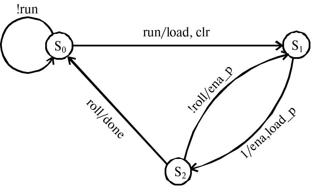Для загрузки результатов суммирования в регистр rp и сдвига содержимого регистра rp требуется два такта синхронизации, поэтому одному циклу умножения соответствуют два состояния: S1 и S2. При переходе из состояния S1 в состояние S2 в регистр rp по сигналу load_p загружается результат суммирования, а по сигналу ena выполняется сдвиг содержимого регистра rb. При переходе из состояния S2 в состояние S1 по сигналу ena_p содержимое регистра rp сдвигается влево. Процесс умножения заканчивается (FSM переходит в состояние S0) после формирования сигнала roll.