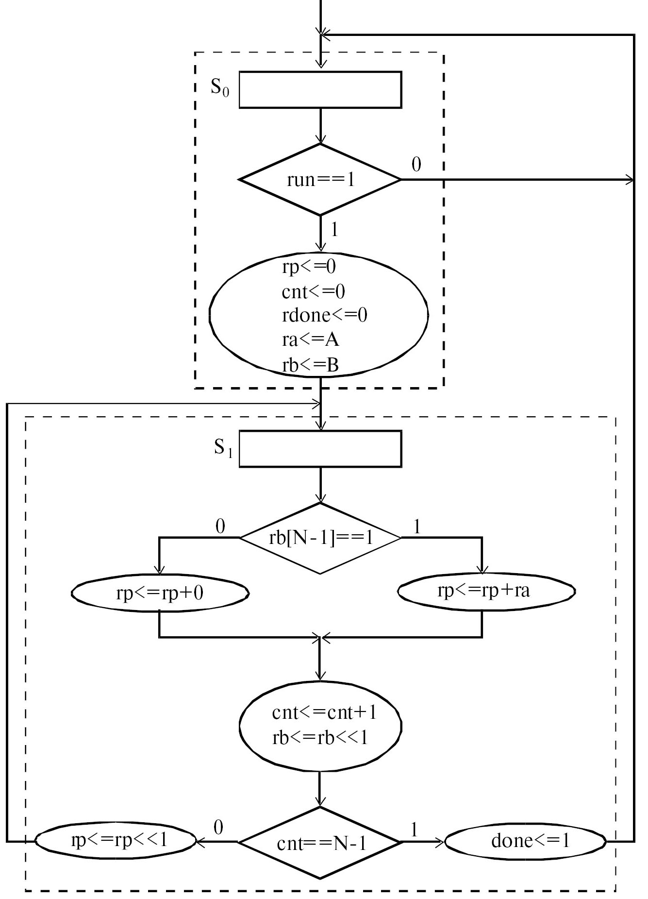 Схема ASMD алгоритма умножения c (рис. 4) состоит из двух блоков ASMD, соответствующих состояниям S0 и S1 FSMD Мили. В состоянии S0 ожидается единичное значение сигнала run, при его установке выполняется инициализация переменных. Состояние S1 соответствует циклу умножения. При rb[N–1] = 1 к содержимому регистра rp добавляется значение множимого (в противном случае ничего не добавляется). Затем увеличивается значение счетчика cnt и выполняется сдвиг влево содержимого регистра rb. В этом же блоке ASMD проверяется значение счетчика cnt. Если cnt = N–1, то устанавливается флаг done и процесс умножения заканчивается, иначе содержимое регистра rp сдвигается влево и цикл умножения повторяется.