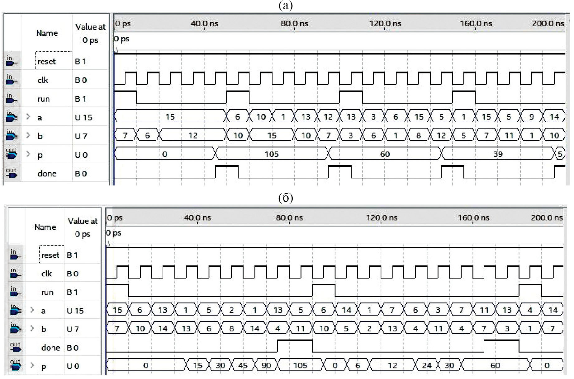 Рис. 5. Результаты моделирования умножителя, спроектированного по методике ASMD-FSMD (а) и построенного по традиционной методике (б).